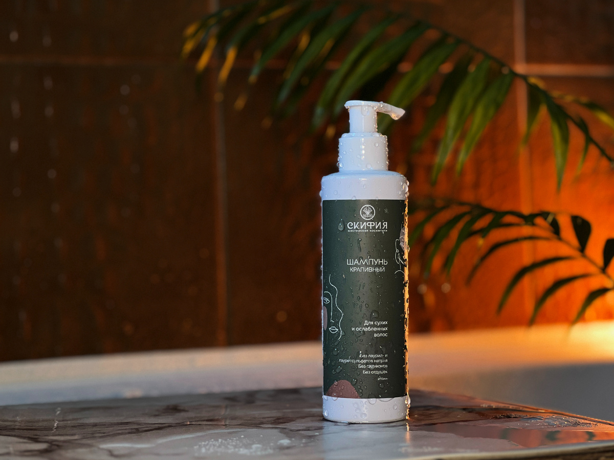 Честно, при первом использовании он мне не понравился. Показался типичным бессульфатным шампунем, который плохо промывает. Но потом я поменяла нанесение (дополнительно прочла инструкцию к нему), и сразу полюбила! Своему крапивному шампуню я выделила место на полочке в ванной. Это награда высшей категории, поскольку для моего бьюти-канала приходится тестировать много косметики: ежемесячно мне присылают шампуней, бальзамов и других средств для волос в таком количестве, что за век их не израсходуешь. Интересные варианты для блога я ищу на маркетплейсах и покупаю сама. Таким стал вот этот красавчик: крапивный шампунь для сухих и ослабленных волос от крымского бренда "Скифия". В прошлом месяце я рассказывала про их липовый гидролат и петрушечный крем, которые мне понравились. Первое, на что я обратила внимание — база шампуня. ПАВы и прочие компоненты растворены не просто в воде, а в гидролате крапивы. Крапива давно известный и мощный компонент в уходе за волосами. Что экстракт, что гидролат