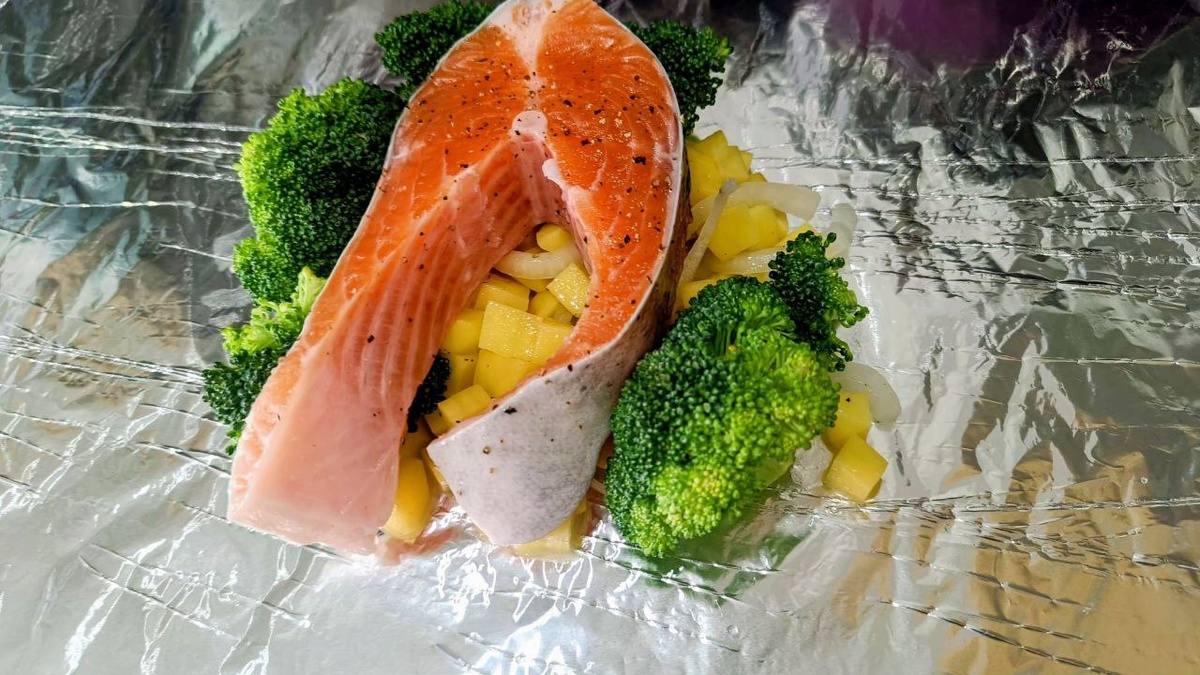 Хотите устроить себе кулинарный праздник, не тратя много времени и сил? Тогда этот рецепт специально для вас! Форель — рыба благородная, вкусная и полезная одновременно. Она богата белком, витаминами группы B, омега-3 жирными кислотами и легко усваиваемым железом. А её нежный аромат отлично сочетается с любыми овощами. o Свежая форель — стейк среднего размера (примерно 200 г) o Картофель — 2 средних клубня o Брокколи — чуть меньше половины головки o Соль, перец, специи по вкусу (например, сушёный тимьян или розмарин) o Фольга o Растительное масло — немного для смазывания Промойте рыбу холодной водой и обсушите бумажным полотенцем. Удалите чешуйки и внутренности, если они ещё присутствуют. Посолите, поперчите стейки изнутри и снаружи. Клубень картофеля очистите и порежьте небольшими кубиками. Брокколи разделите на небольшие соцветия и промойте прохладной водой. Разложите фольгу на рабочей поверхности, слегка смажьте растительным маслом. Положите картофельные кубики на дно слоями, сверху