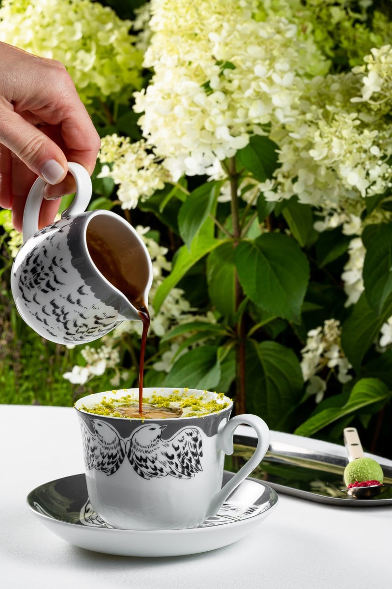 Аффогато на богатом Аффогато – десерт из мороженого, тонущего в горячем эспрессо. Такой готовят сейчас в Buro. Tsum. Такой, да не совсем. Во-первых, мороженое в нем фисташковое и красит аффогато в изумрудный. Во-вторых, подают его в чашке костяного фарфора с молочником из коллекции «Перья на черном» работы Алены Ахмадуллиной. Все потому, что это коллаб с брендом «Хохлома». Ну а раз коллаб, да еще в ЦУМе, то к чашке аффогато за 580Р приносят подарки на богатом: сертификат на 30000 ₽, скидку 30% на «Хохлому» и коллекционную чайную пару из костяного фарфора (в онлайн-магазине бренда они стартуют от 7000Р). Не очень понимаю, как это возможно, но чтоб все коллабы были такими, а не это ваше мыльце в подарок. @foodiscovery