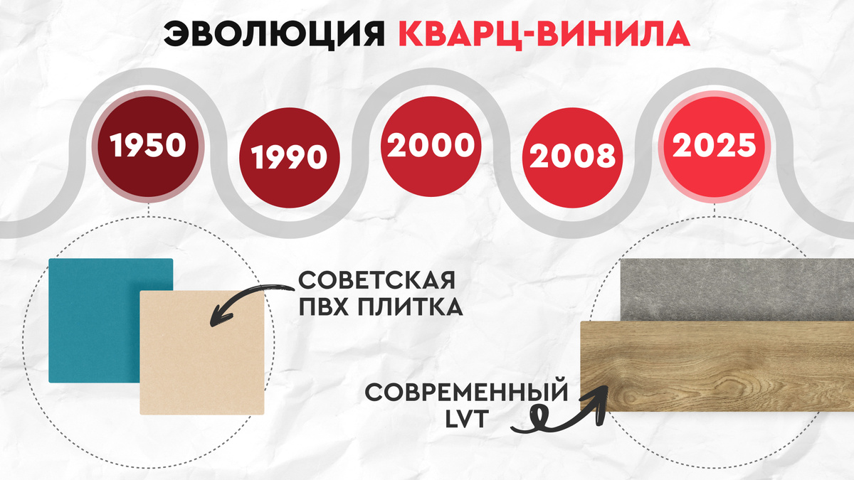 Сегодня кварц-виниловая плитка (она же LVT) — звезда каталогов напольных покрытий. Её хвалят за влагостойкость, износостойкость, простоту ухода и богатый выбор дизайнов. Но многие в комментариях любят подшутить: «Эх, в Союзе такая же плитка была! Помним мы те квадратики в хрущёвках — а теперь их втюхивают нам подороже!» Давайте разберёмся: правда ли это «втюхивание» или всё-таки мы имеем дело с эволюцией материала, который за эти годы прошёл путь от скромного «дедушки» до технологичного «премиум-пола»? Да, первая ПВХ плитка появилась в СССР. Гомогенная, однослойная, из поливинилхлорида, она выпускалась в виде квадратов нескольких оттенков — красного, жёлтого, зелёного, синего, серого. Плюсы по тем временам были весомые: Этим материалом отделывали всё подряд — от квартир в «хрущёвках» до коридоров школ и заводоуправлений. И, что удивительно, кое-где он и сегодня сохранился в рабочем состоянии — после 40+ лет службы. В Стране восходящего солнца советскую идею заметили и доработали. Так р