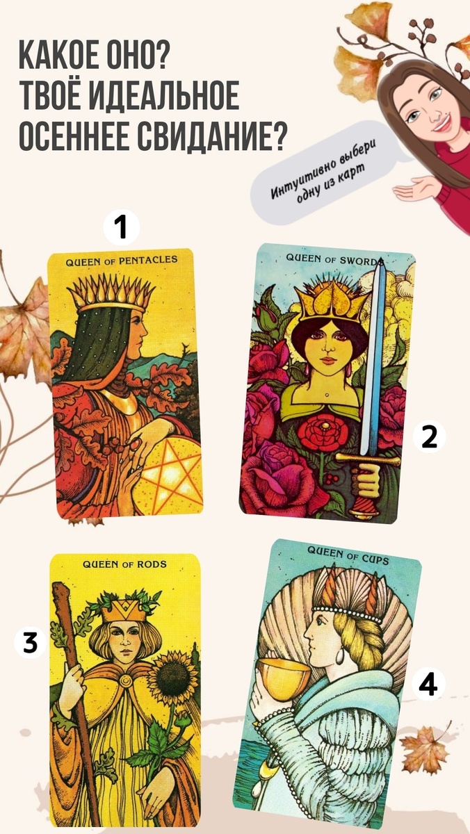 Принято считать, что осень это депрессивное время года, но мне хочется возразить этому стереотипному мнению. Оглянись вокруг, сентябрь такой вкусный & сочный, пропитан уютом и эстетикой сезона 👑Королевы таро, спешат на помощь к любителям романтики 🎴тебе даже не нужно будет что-то придумывать, гугля идеи для романтической встречи. Просто интуитивно выбери одну из карт. Затем читай сценарий осеннего свиданя в карусели, который соответствует выбранной карте Ещё больше не душного таро у меня в телеге, вэлкам https://t.me/innapsihotarot