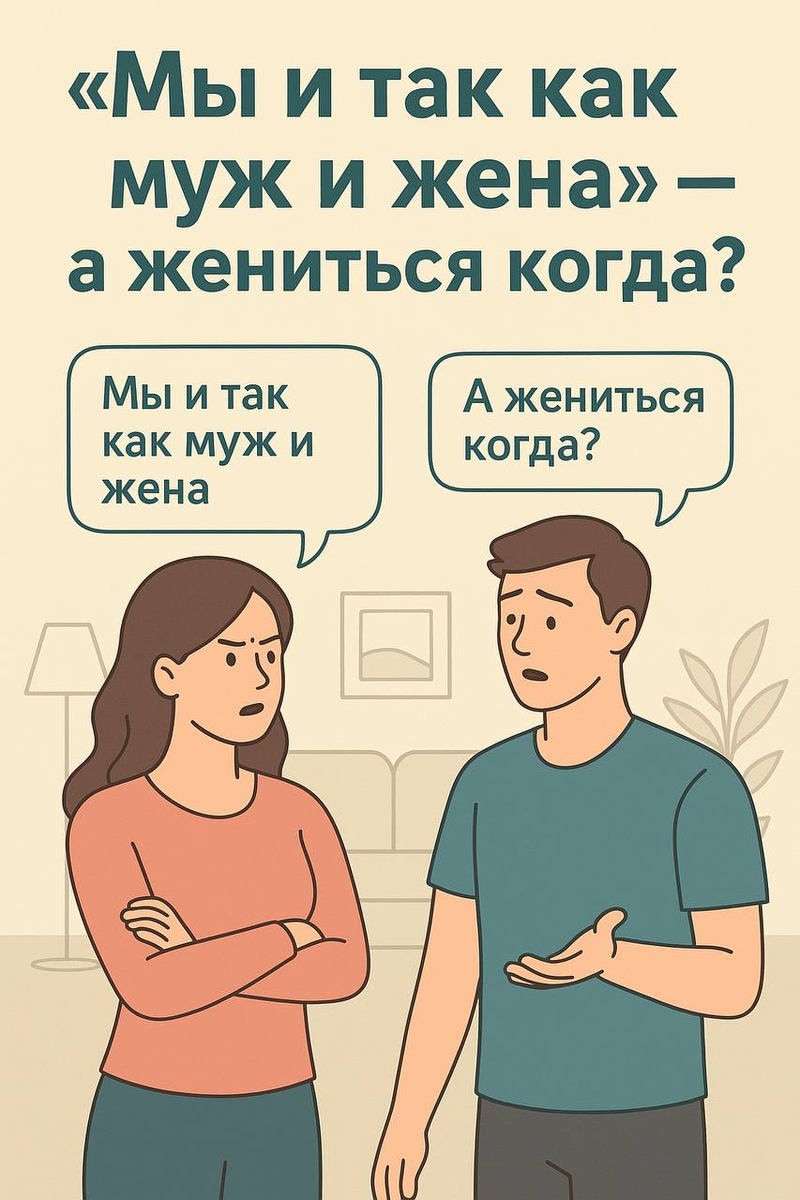 Эта фраза знакома многим женщинам. Мы съехались, у нас общий быт, иногда даже совместный кредит и кот, который спит ровно посередине кровати. Он говорит друзьям: «Это моя жена», соседке — «это моя супруга», а в ЗАГС идти не спешит. Звучит как шутка? А для кого-то — реальность.
