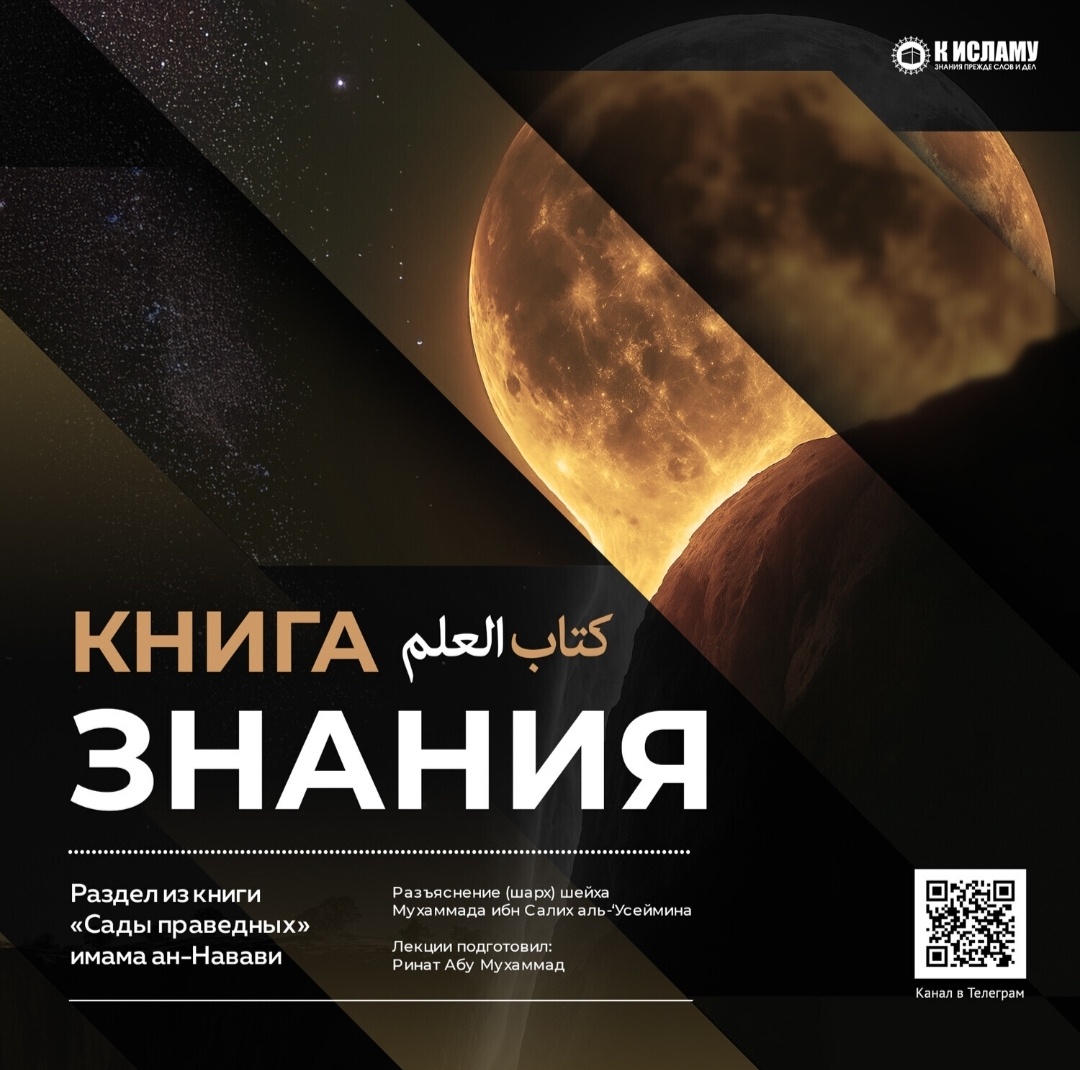 Представляем вашему вниманию серию лекций о достоинстве приобретения и распространения знаний. «Книга знания» — раздел, который привел имам ан-Навави, да помилует его Аллах, в своем сборнике «Сады праведных». В данных лекциях мы прочитаем толкование шейха Мухаммада ибн Салих аль-‘Усеймина, да помилует его Аллах, которое он дал, разбирая аяты и хадисы, приведенные в данном разделе. Лекции подготовил: Ринат Абу Мухаммад, да хранит его Аллах. Лекции доступны в канале Телеграм «Требуем знания». ······· ❝ ······························· » СЛОВА ВСЕВЫШНЕГО ······························ ❞ ········ قَالَ اللَّهُ تَعَالَى: ﴿وَقُلْ رَبِّ زِدْنِي عِلْمَاً﴾ [طه: 114]، Аллах Всевышний сказал: «...и говори: “Господь мой, прибавь мне знания!”» Сура «Та Ха», аят 114.