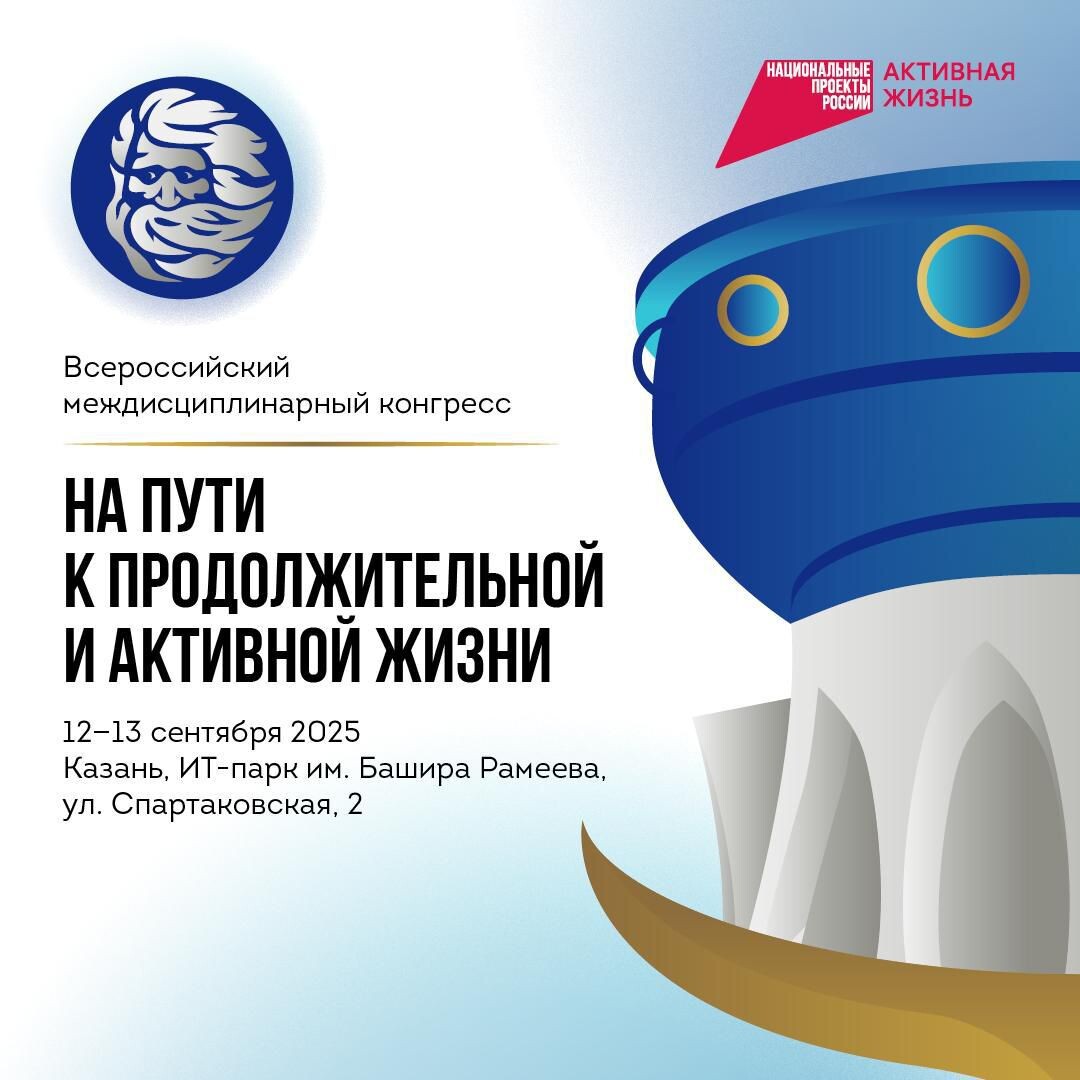 12–13 сентября в Казани впервые состоится Всероссийский междисциплинарный конгресс «На пути к продолжительной и активной жизни». 📍Место проведения — ИТ-парк им. Башира Рамеева (ул. Спартаковская, 2). Формат проведения — очный. Сайт мероприятия: https://clck.ru/3NBaPi Научная программа конгресса будет представлена по 6 направлениям: 🔹неврологические нарушения и ментальное здоровье; 🔹атеросклероз и сердечно-сосудистые нарушения; 🔹остеопороз; 🔹ревматические нарушения; 🔹питание и нутритивная поддержка; 🔹технологии продления жизни. Цель конгресса — предоставить специалистам комплекс современных знаний по ведению пациентов зрелого, пожилого и старческого возраста, объединить специалистов в решении единой задачи — повышении качества и продолжительности жизни пациентов в рамках реализации задач новых национальных проектов («Продолжительная и активная жизнь», «Семья»). Участие бесплатное!