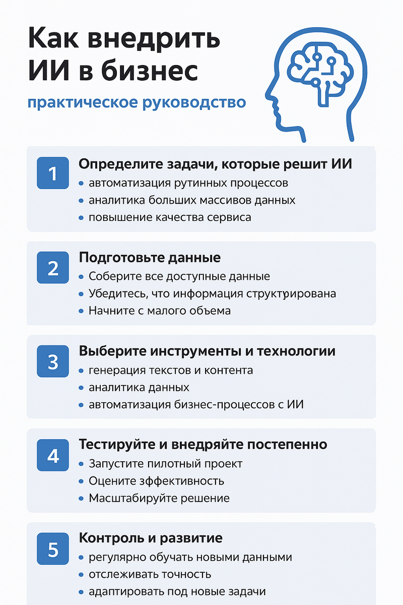 Искусственный интеллект (ИИ) перестал быть уделом только крупных корпораций. Сегодня его активно используют компании малого и среднего бизнеса для оптимизации процессов, снижения издержек и роста прибыли. Но как именно внедрить ИИ, чтобы он принес реальную пользу, а не остался «игрушкой для презентаций»? ИИ не нужен «ради моды». Сначала важно понять, где именно он может помочь: 📌 Советуем начать с одной конкретной задачи, которую можно быстро протестировать. ИИ «учится» на данных. Чем они качественнее, тем лучше результат. Сегодня необязательно разрабатывать ИИ «с нуля». Есть готовые решения: Это позволяет внедрить ИИ даже без собственной команды разработчиков. Лучший подход — поэтапный: Важно: вовлекайте сотрудников. Объясняйте им, как работать с ИИ, чтобы он стал помощником, а не «угрозой рабочим местам». ИИ не «настроил и забыл». Его нужно: Внедрение ИИ — это не про будущее, а про конкурентоспособность здесь и сейчас. Начав с малого, можно уже через несколько месяцев увидеть первые