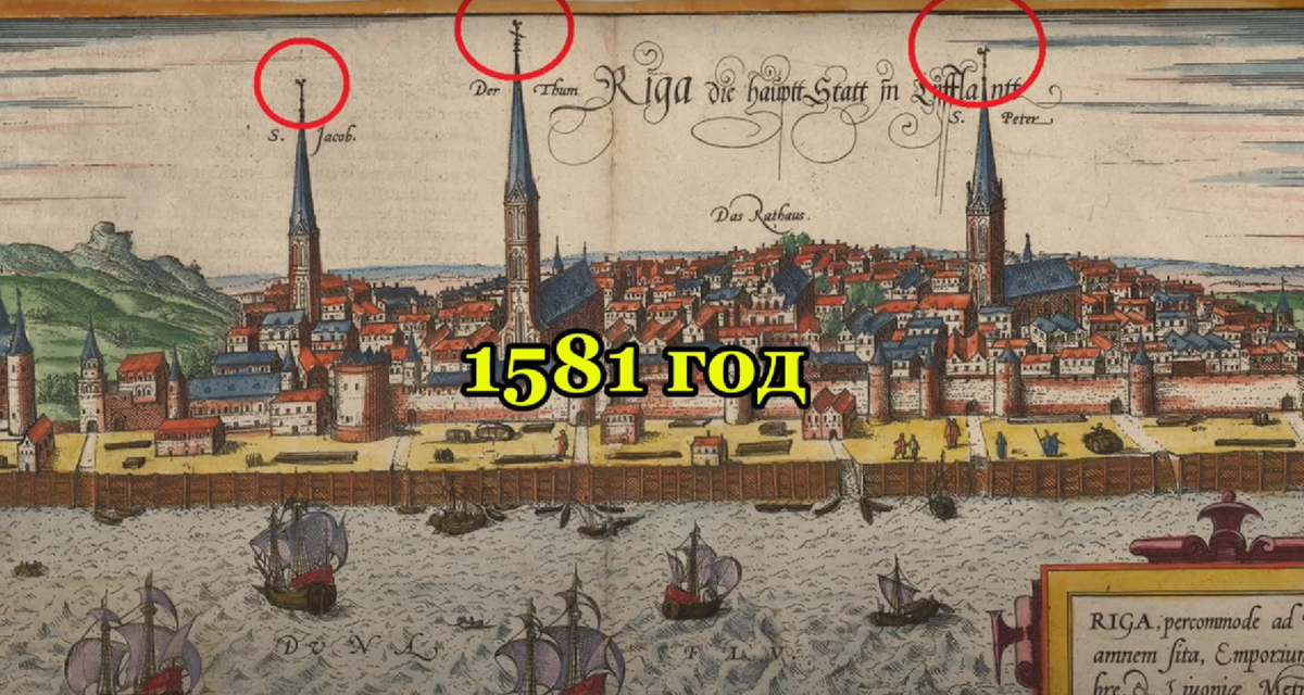 Возьмём гравюры Риги. На изображениях города начала XVI века никаких крестов на шпилях нет — только флажки. Но уже на гравюре 1581 года мы видим петушков. На изображении 1612-го они прорисованы особенно отчётливо.