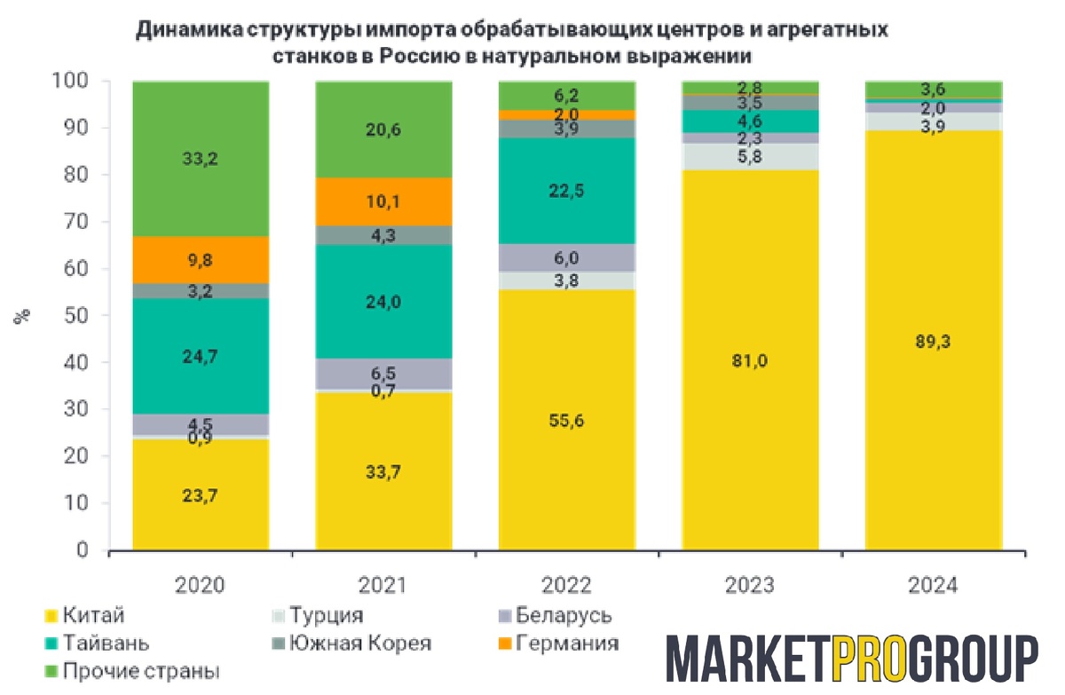 Согласно данным исследования «Анализ рынка металлообрабатывающих центров в России в 2025 году», выпущенного компанией MarketProGroup, в структуре импортных поставок обрабатывающих центров за пятилетний период произошли существенные изменения. Прежде всего, доля китайской продукции резко возросла – с 23,7% натурального объема импорта в 2020 году до рекордных 89,3% в 2024 году. Китайские обрабатывающие центры заместили на рынке оборудование из Германии, Японии, Южной Кореи и других стран.