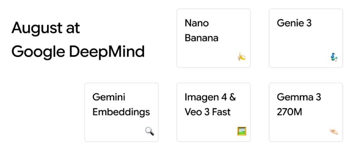 В августе Google выкатил просто космический набор продуктов и технологий. Главные звёзды месяца – Nano Banana (Gemini 2.5 Flash Image), Gemini Embedding, Veo 3 Fast, Genie 3, Imagen 4 Fast и Gemma 3 270M. Помимо этого появились Perch 2, Kaggle Game Arena, Gemini API URL Context, а также обновления AI Studio Builder (новый интерфейс, подсказки для промптов, интеграция с GitHub) и AI Studio UI (удобный выбор моделей, чат, скроллинг и другое). Рынок ИИ растёт с бешеной скоростью и становится всё разнообразнее. Интересно, чем нас удивит сентябрь.