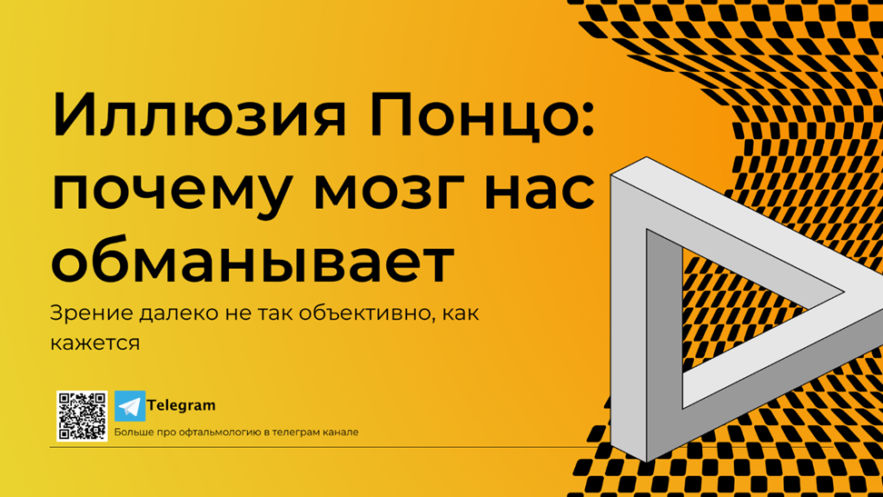 Мы привыкли доверять своим глазам. Но зрение далеко не так объективно, как кажется. Один из лучших примеров - иллюзия Понцо, открытая итальянским психологом Марио Понцо в 1911 году. Представь железнодорожные рельсы, уходящие вдаль. Они кажутся сходящимися, хотя на самом деле параллельны. Понцо понял: именно этот эффект перспективы можно использовать, чтобы мозг "ошибался". Он нарисовал две одинаковые горизонтальные линии поверх сходящихся линий. Верхняя линия, находящаяся ближе к "точке схода", казалась длиннее нижней - хотя они идентичны по размеру. Наш мозг устроен так, что он никогда не воспринимает картинку "как есть". Ему важно не просто видеть линии и формы, а понимать, что это значит в реальном мире. Поэтому он всегда добавляет перспективу - как будто мы смотрим на трёхмерное пространство, а не на рисунок на бумаге. Представьте: вы стоите на рельсах и смотрите вдаль. Чем дальше уходят рельсы, тем ближе друг к другу они кажутся. Хотя на самом деле расстояние между ними одинаковое