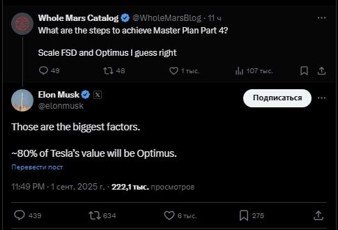 Илон Маск заявил, что будущее Tesla будет связано не столько с электромобилями, сколько с гуманоидными роботами Optimus. Он отметил, что около 80 % стоимости компании в перспективе будет приходиться именно на роботов. Если прогноз оправдается, автомобили перестанут быть главным источником дохода компании.