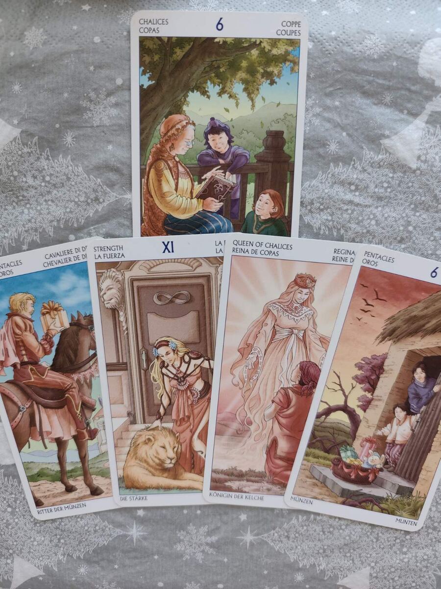 6 Кубков – Рыцарь Пентаклей – Сила – Королева Кубков – 6 Пентаклей Общее настроение: Это очень гармоничный, мягкий и в то же время зрелый расклад. Он показывает баланс между прошлым и будущим, стабильностью и эмоциями, а также тему обмена — чувствами, поддержкой, вниманием. По картам: 6 Кубков – воспоминания, ностальгия, чистые искренние чувства, часто намёк на связь с прошлым (человек, ситуация, эмоции). Здесь есть элемент нежности и доброты. Рыцарь Пентаклей – движение вперёд, но медленное, надёжное. Это про постепенное выстраивание отношений/дела, без резких шагов. Верность, ответственность. Сила – внутренний контроль, умение управлять эмоциями и страстями, мягкая уверенность. Эта карта часто говорит о том, что ситуация требует терпения и умения мягко, но настойчиво вести её в нужное русло. Королева Кубков – очень тёплая, женственная энергия. Она про глубокую эмоциональность, интуицию, заботу и способность чувствовать другого. 6 Пентаклей – карта обмена и баланса: щедрость, взаимоп