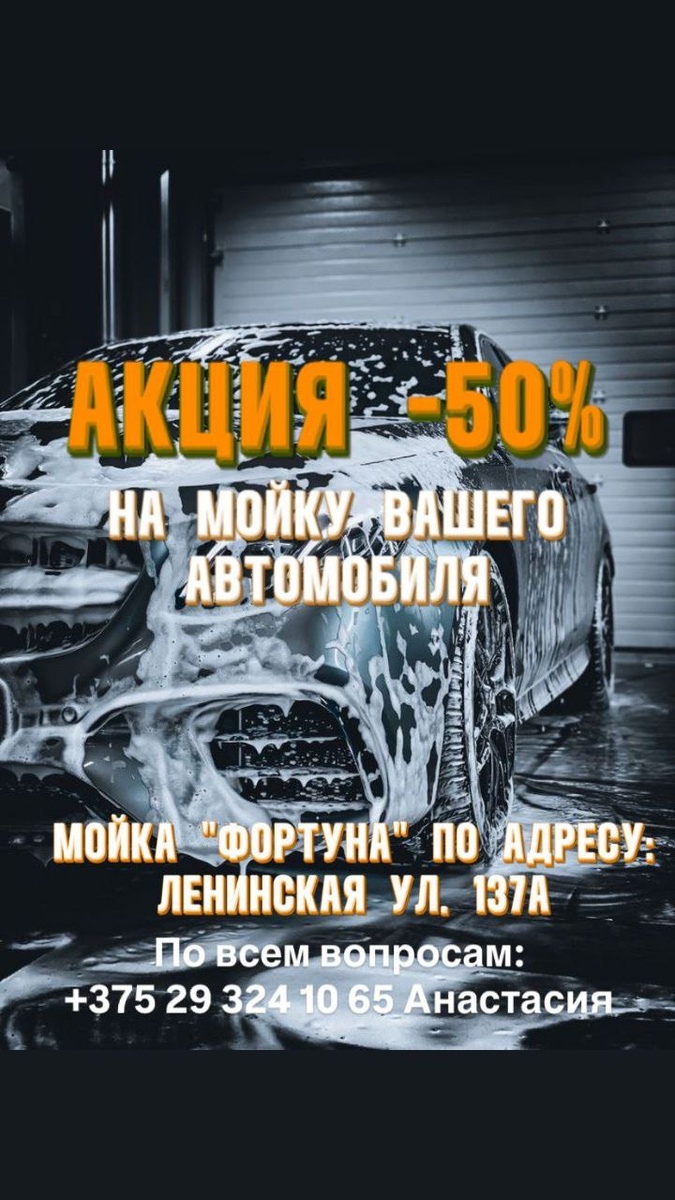 Друзья, жители и гости города Несвиж! 🚗✨ Мойка «СТО ФОРТУНА» объявляет масштабную акцию и ценопад на все виды мойки с 1 по 30 сентября!🔥🔥🔥 - 50% ✔️ Что вас ждёт? • 🚙 Качественная мойка автомобиля по суперценам. • ☕️ Пока мы заботимся о вашем авто, вы наслаждаетесь чашечкой кофе в уютной атмосфере. Наши преимущества: • Высокое качество работы. • Удобное расположение: Ленинская ул, 137А. • Удобный график: мы работаем с 9:00 до 19:00. Не упустите шанс привести свой автомобиль в идеальное состояние по выгодной цене! Записывайтесь заранее по телефону: +375 29 324 10 65 или просто приезжайте! Мы ждем вас! ИП Ко Д.А. УНН 693154210.
