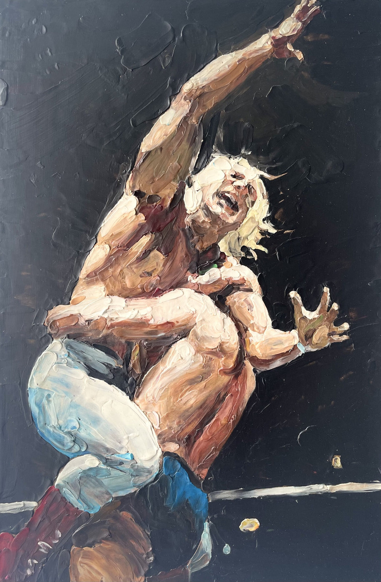 Галерея ART&BRUT запускает свежий проект художника Антона Левина — серию «Body Slam», где античные мифы соседствуют с современным рестлингом. Звучит неожиданно? Именно на этом и построен весь замес. Куратор выставки Роман Круглов поясняет: «Барочные сюжеты всегда умели подсвечивать мускулы так, что забываешь обо всём, кроме тела. Возьмём миф о “Кузнице Вулкана”: вроде бы про молнии для Юпитера, но на деле — о фабрике маскулинности. Насилие там как бы есть, но его будто прячут за торжеством силы и форм». Левин переносит эту мифологическую «кузню» в ринг рестлинга. Теперь насилие не в тени, а прямо на сцене: удары, броски, театральная жестокость. Но зритель понимает: всё это шоу. Важнее здесь тело, гипертрофированное ироничное изображение мускулов, чем сама драка. Язык работ Левина нарочито прямой, даже избыточный. Он копирует, повторяет, множит одни и те же образы, превращая их в визуальную «тавтологию». И в этом, по сути, отражается наш век — эпоха перепроизводства, где даже мифы превр