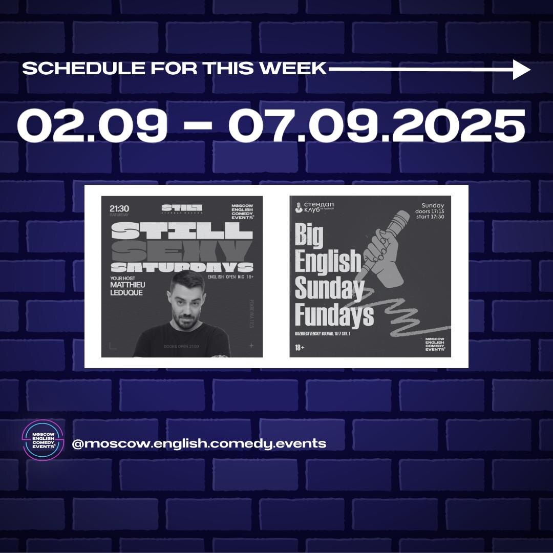Schedule for this week (02.09 – 07.09)❗️ -----‐----------------------- 🕤Saturday, September 6th, 9:30 PM – Still Sexy Saturdays 🎤Open Mic 🎟Entrance: Pay what you want (any paper note or transfer) 💵 🔗 Register for free 🫰 pay upon arrival 📍Still StandUp Moscow 🗺 Pokrovka 17c5, through the arch with the pink lights 🏙 Blue building directly inside the courtyard -----‐----------------------- 🕠Sunday September 7th, 5:30 PM - Big English Sunday Fundays 📺Special appearances by famous Russian comics 🎟️Entrance: FREE 💸 Donations welcome, one drink minimum 🔗Reserve for free 📍Stand Up Club на Трубной 🗺 Map: Rozhdestvensky Blvd, 10/7 С1
