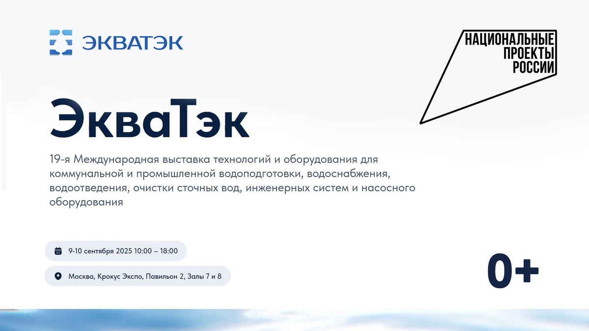 Высокотехнологичные российские разработки представят на выставке оборудования для водной отрасли в Москве в поддержку задач нацпроекта «Экологическое благополучие», утвержденного Президентом РФ. 9-11 сентября в «Крокус Экспо» свои разработки по развитию и модернизации инфраструктуры водоснабжения и водоотведения представят 234 российских и 192 зарубежных компании. В числе представленного оборудования системы очистки вод, насосные станции, а также разработки в области химии, реагентов, труб, автоматизации и цифровизации. Выставка Экватэк наглядно демонстрирует ключевые направления, где российские компании уже вытесняют зарубежные аналоги. Без возрастных ограничений
