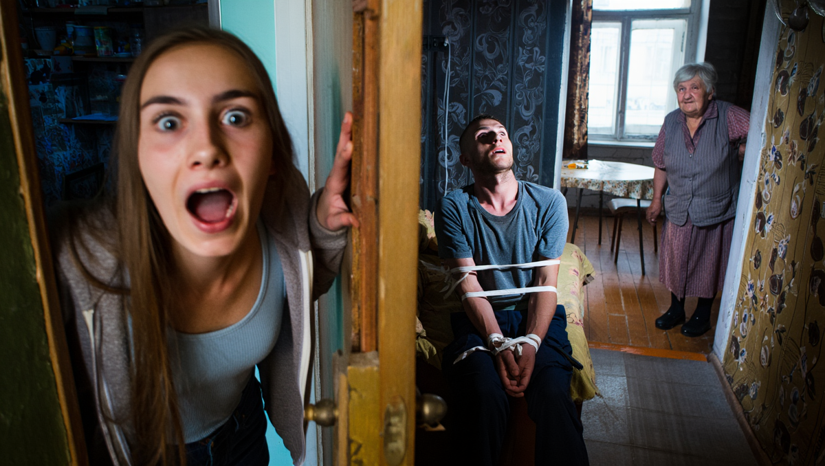На кровати, привязанный к спинке широкими полосами ткани, сидел её муж. Рот его был заклеен скотчем, руки связаны за спиной. Глаза полны ужаса и мольбы.