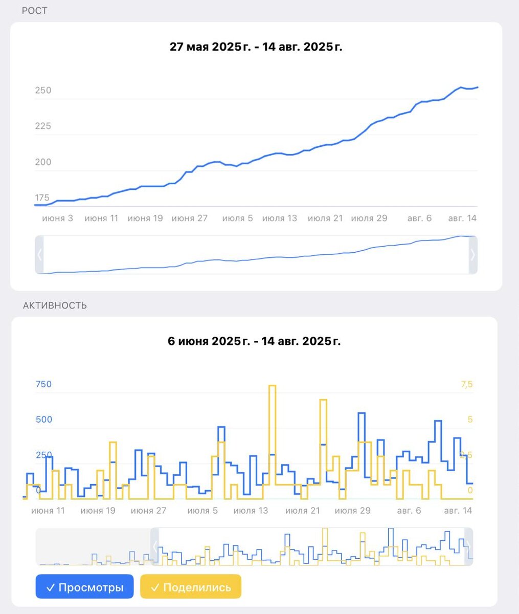 На скринах выше видим рост пересылок постов и рост подписчиков