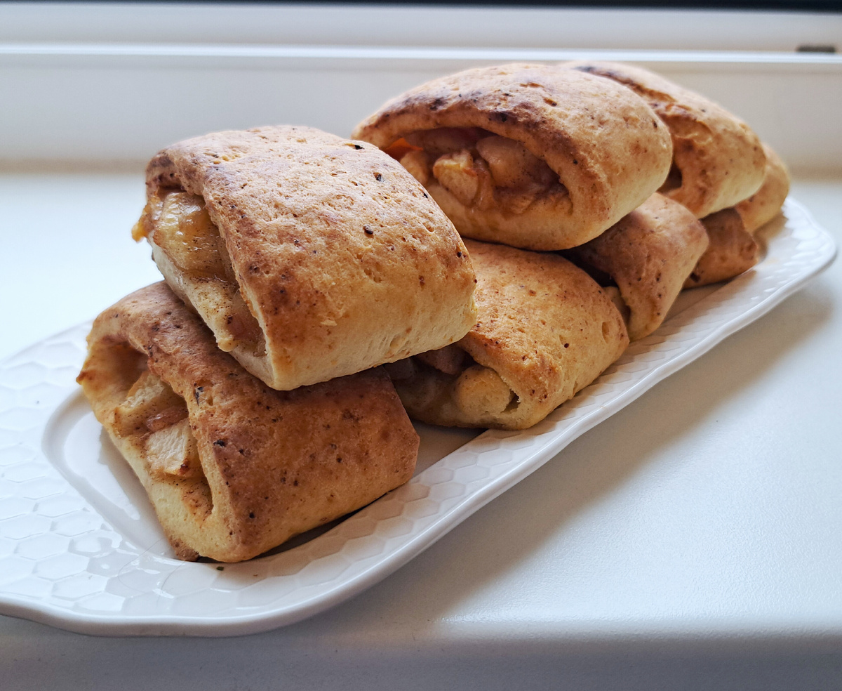 - Тесто достать, раскатать в пласт примерно 1 см толщиной, выложить начинку по центру. Если пласт поделить на 3 части, то яблоки будут занимать 1 часть, остальные две нахлестнуть на начинку и защипнуть с одного края. Затем разрезать рулет на кусочки по 5 см.
