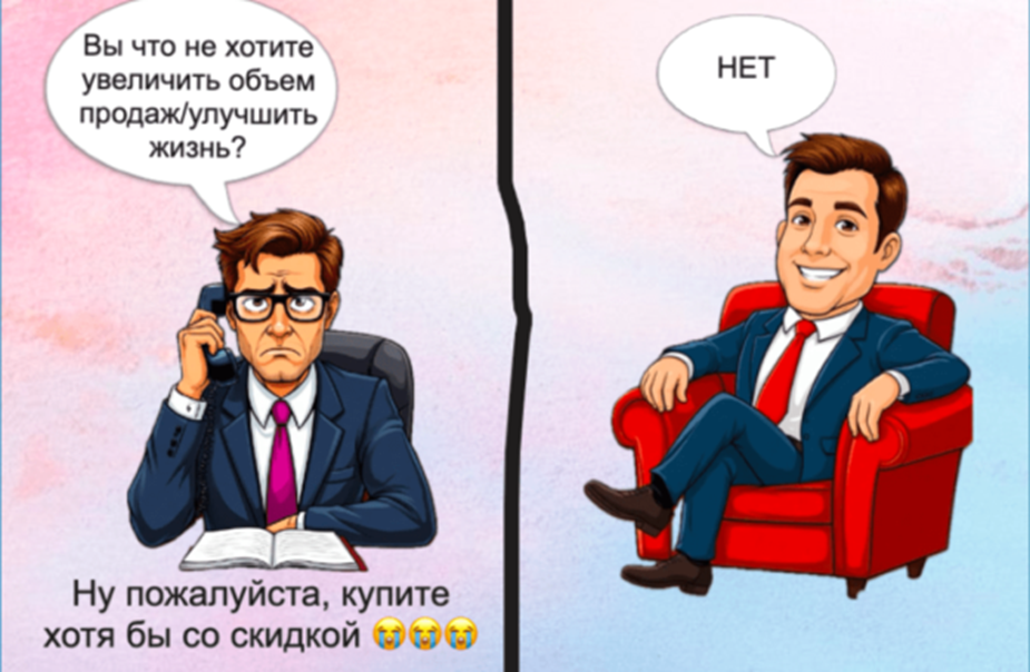 У меня другая задача – я ищу гипотезы о том чем могу быть полезен конкретному клиенту и проверяю их одну за одной. В результате клиенты соглашаются не потому, что я дал скидку или уболтал – нет. Соглашаются, потому что увидели ценность в том, что я предложил. Сами.
