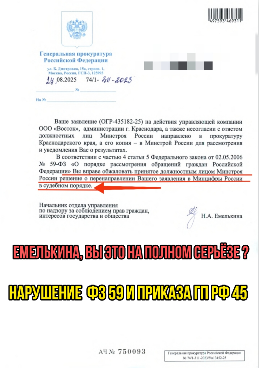 Дорогие товарищи проверяющие, объясните мне, как неискушенному гражданину, с какой стати мое заявление о бездействии федерального Минстроя России и несогласии с его незаконной переадресацией было направлено госпожой Емелькиной... в прокуратуру Краснодарского края?!