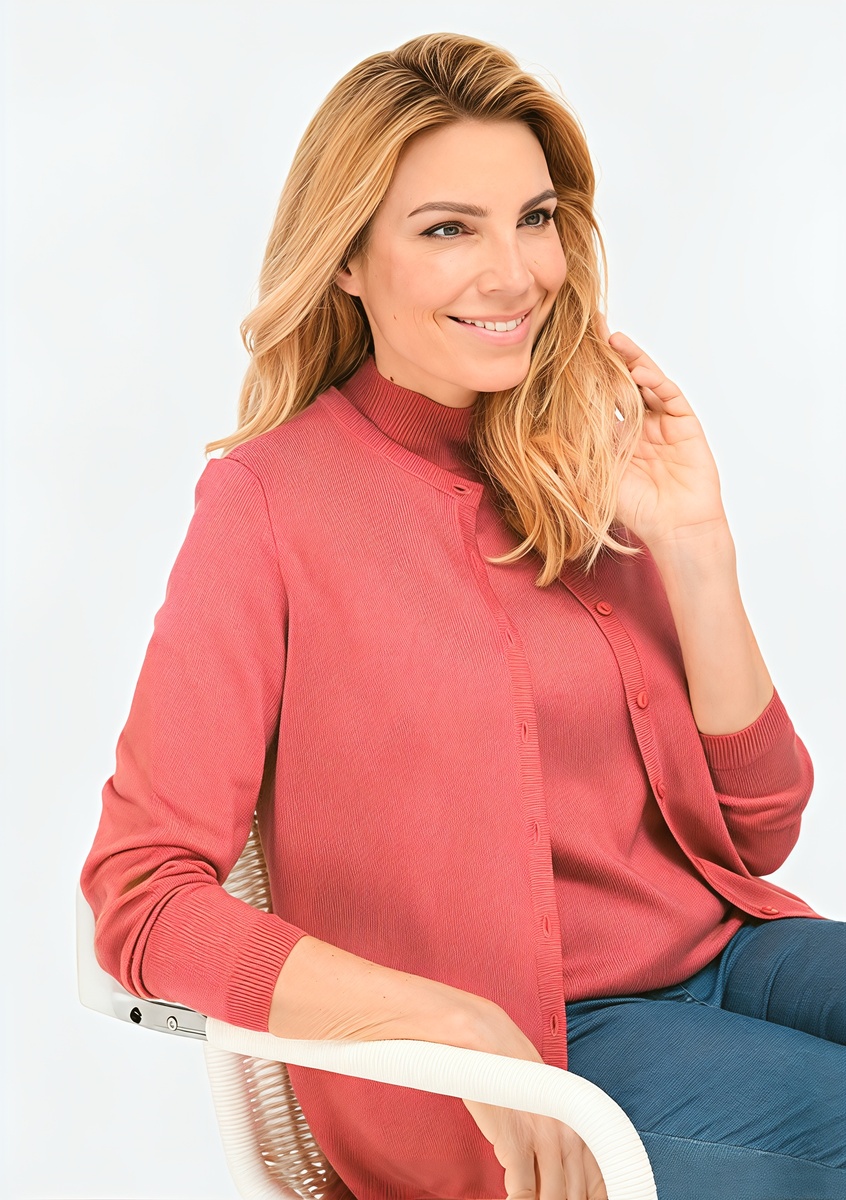 Для 60+: Винно-красный кардиган + серая юбка + жемчужные серьги. Элегантно и возрастно уместно.