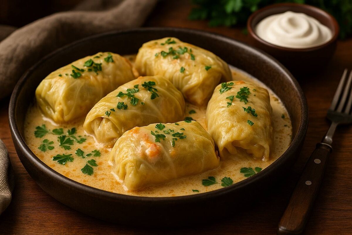 Мы любим более мягкий, бархатный вкус, когда капустный лист остаётся нежным, начинка — сочной, а сверху всё объединяет тёплая сметанная заливка.
