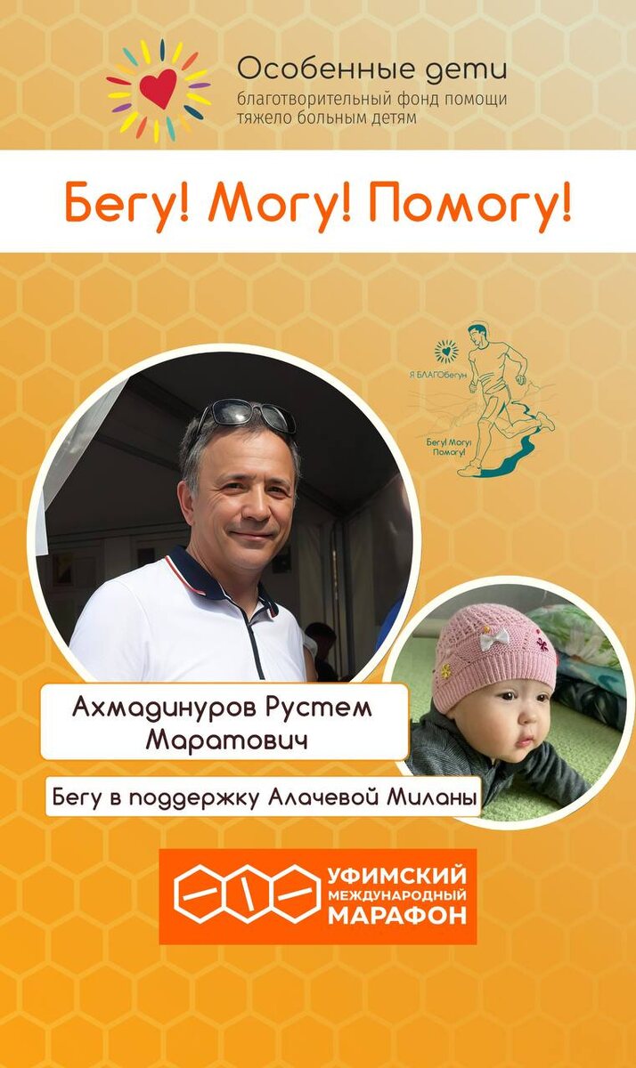 7 сентября в рамках Уфимского международного марафона бегу в качестве благобегуна в поддержку Алачевой Миланы, которой нужна помощь в лечении. Желающие присоединиться просьба перечислять средства (от 300 руб и выше) по ссылке: https://bf-osobennyedeti.ru/charity_battle/blagobegun/ahmadinurov_rustem 🙏 Спасибо тем кто уже помог: Фагит Латипов Эльвина Газизова Рамзиль Салимьянов Керим Баширов Давид Гаптракипов Тимергали Уразгулов Оксана Хамидуллина Виль Габдуллин Гаяз Батыев Сергей Жуков Евгений Оськин Антон Горбачев Агван Погосян Салават Харасов Валерий Кадыров Розалия Мадина и др.