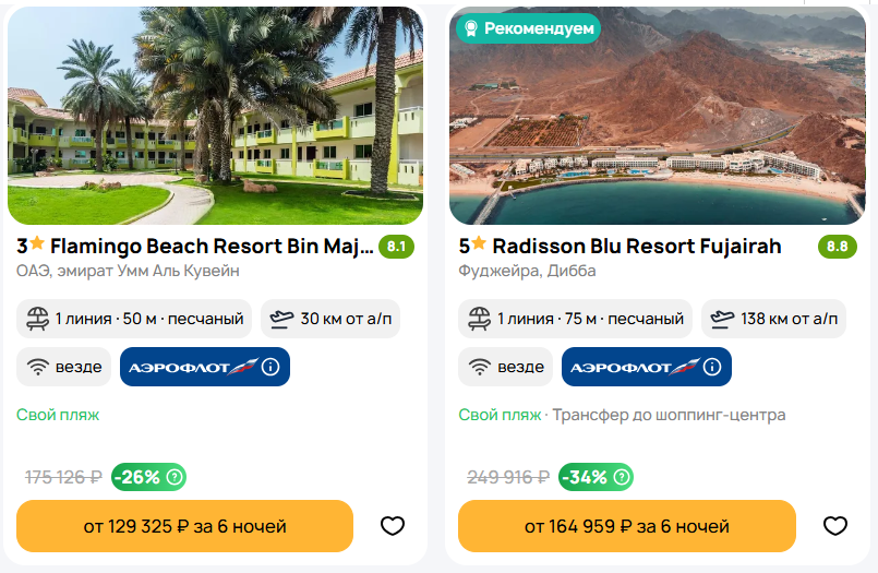 🔥 Туры в ОАЭ "всё включено" из Москвы на 6-13 ночей🔥 Парочка выгодных вариантов: Тур в отель 3⭐️Flamingo Beach Resort Bin Majid, до пляжа 50 м, Умм Аль Кувейн, от 6 ночей, всё включено, прямой чартерный. Вылет 12 сентября, от 64663 руб/чел Забронировать: https://checkintime.ru/lego Тур в отель 5⭐️Radisson Blu Resort Fujairah, до пляжа 75 м, Фуджейра, от 6 ночей, всё включено, прямой чартерный. Вылет 12 сентября, от 82480 руб/чел Забронировать: https://checkintime.ru/c26p Тур в отель 5⭐️Radisson Blu Hotel & Resort Abu Dhabi Corniche, до пляжа 245 м, Абу-Даби, от 6 ночей, всё включено, прямой чартерный. Вылет 12 сентября, от 93093 руб/чел Забронировать: https://checkintime.ru/o3tl Все предложения: https://checkintime.ru/ygwh ⚠️Цены на момент публикации и указаны на одного человека с перелетом и проживанием. Переходя по ссылке цена отобразиться на 2-х человек 🏖 Поиск туров | ✈️Авиабилеты