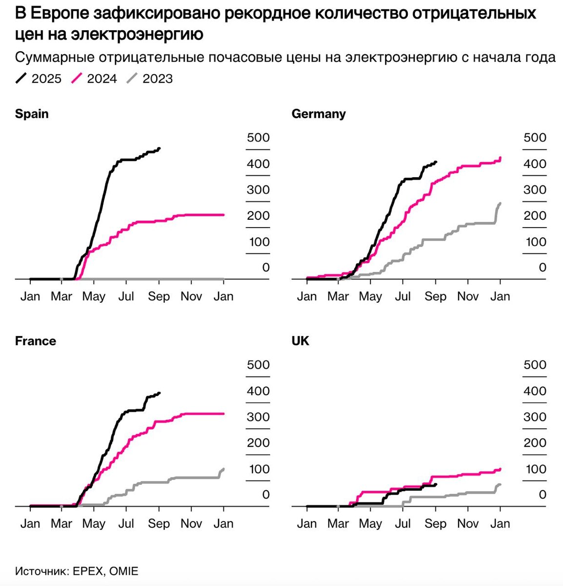 Солнечная энергетика продолжает убивать испанский оптовый рынок электроэнергии Количество часов с отрицательными ценами на электроэнергию в Испании уже вдвое превысило общее прошлогоднее значение. По данным энергетической биржи OMIE, в этом году на иберийском рынке было зафиксировано более 500 часов с отрицательными ценами на электроэнергию. На других рынках, включая Германию и Францию, также наблюдается значительный рост, хотя и не столь выраженный На этом фоне первостепенное значение принимает интеграция систем накопления энергии. Правительство страны подготовило план стоимостью €400 млн, но парламент Испании заблокировал предложение правительства страны об усилении контроля за инфраструктурой.
