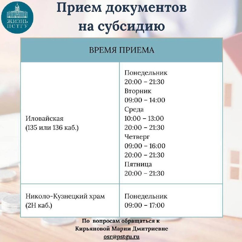В общежитии начался новый приём документов на субсидии на оплату проживания Студенты могут подать документы до 8 сентября 2025 г. Тем студентам, кто уже получает субсидии, необходимо принести развёрнутую рекомендацию руководства факультета, а также новую рекомендацию духовника / исповедующего священника в Москве, обновлённые справки о доходах семьи в случае их изменения. Первокурсники могут подавать документы на субсидию только со второго семестра. — Полный комплект документов и дни приёма смотрите в источнике. — По всем вопросам обращайтесь к специалисту Социального отдела Марии Дмитриевне Кирьяновой лично, по электронной почте (osr@pstgu.ru). #Отдел_по_социальной_работе_ПСТГУ