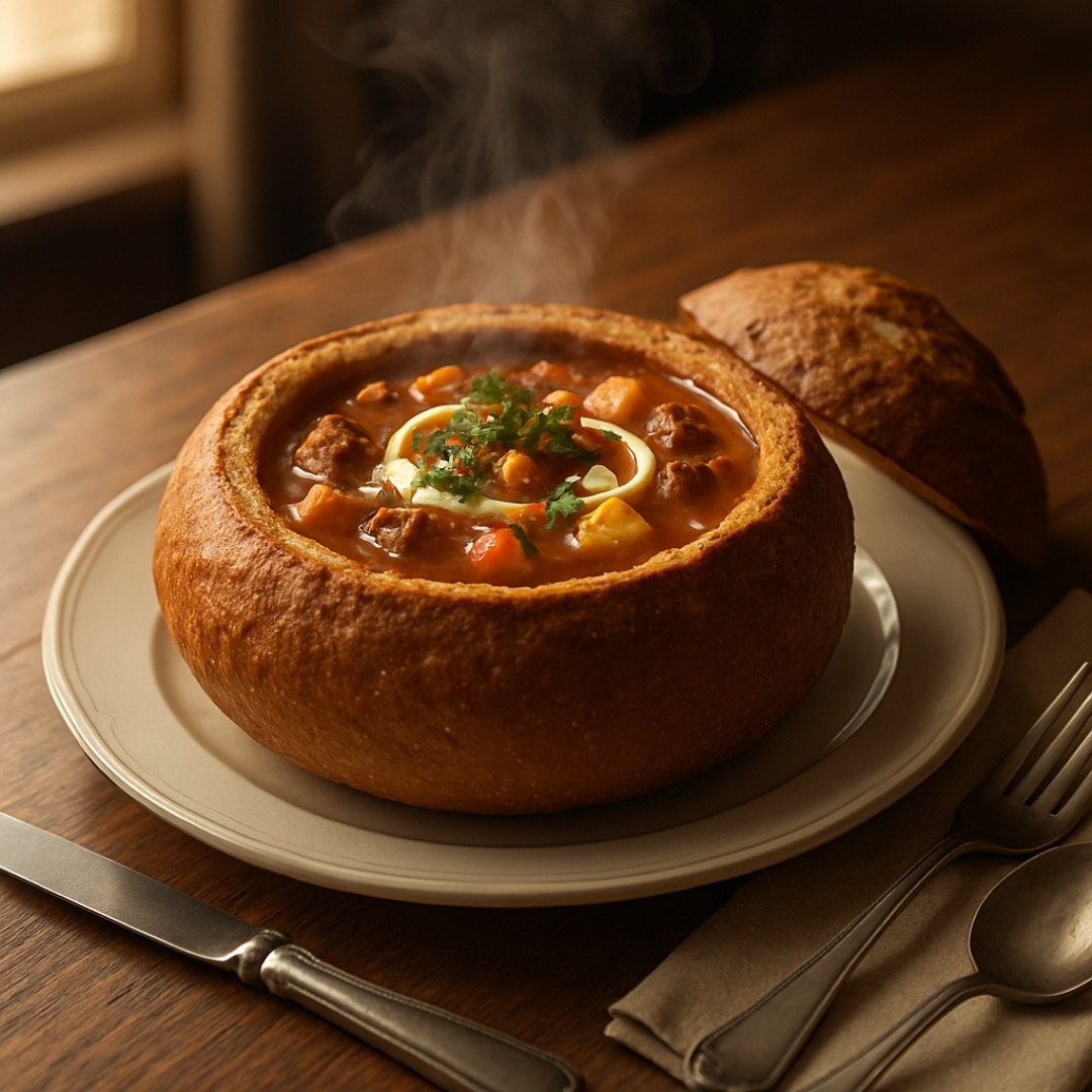 Суп гуляш в хлебе Ингредиенты ⤵️ 🔸 Говядина – 500 г 🔸 Репчатый лук – 2 шт. 🔸 Сладкий перец – 1 шт. 🔸 Помидоры – 2 шт. 🔸 Чеснок – 3 зубчика 🔸 Томатная паста – 2 ст. л. 🔸 Паприка молотая – 1 ст. л. 🔸 Растительное масло – 3 ст. л. 🔸 Бульон – 1 л 🔸 Картофель – 3 шт. 🔸 Соль, перец - 1 щепотка 🔸 Хлебные буханки – 2 шт. Приготовление🍞 1. Мясо нарежьте кубиками, обжарьте до корочки. 2. Добавьте лук, через 5 минут – перец и помидоры. Готовьте 7 минут. 3. Добавьте томатную пасту и паприку, влейте бульон. 4. Тушите 1-1.5 часа под крышкой. 5. Добавьте картофель, варите 20 минут. Посолите, поперчите, добавьте чеснок. 6. Наполните хлебные горшочки супом. Подавайте сразу. Рецепт дня #гуляш #суп #говядина #овощи #хлеб #специи #обед