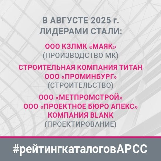 📣📣📣Каталоги Ассоциации развития стального строительства — это инструмент для удобного поиска подрядчиков в области стального строительства по проектированию, изготовлению металлоконструкций и монтажу. ✍️Каждый месяц АРСС публикует рейтинг наиболее просматриваемых компаний в каталогах производителей металлоконструкций, строительно-монтажных организаций и реестре проектировщиков. ❗️По итогам августа 2025 года в ТОП-5 каждого каталога вошли следующие компании: 🔸Каталог производителей металлоконструкций 1️⃣место на протяжении нескольких месяцев сохраняется за ООО «Канский завод легких металлоконструкций «МАЯК» 2️⃣место — ООО «Венталл Стальные Решения» 3️⃣ место — АО «Кулебакский ЗМК» (КЗМК) 4️⃣ место разделили два предприятия: ООО «Лино» (Stallin) и ООО «Тихвинский завод строительных металлических конструкций (ТЗСМК)» 🔹Каталог строительно-монтажных организаций 1️⃣ место поделили между собой две компании — ООО «Строительная компания Титан» и ООО «Проминбург» 2️⃣ место — ООО