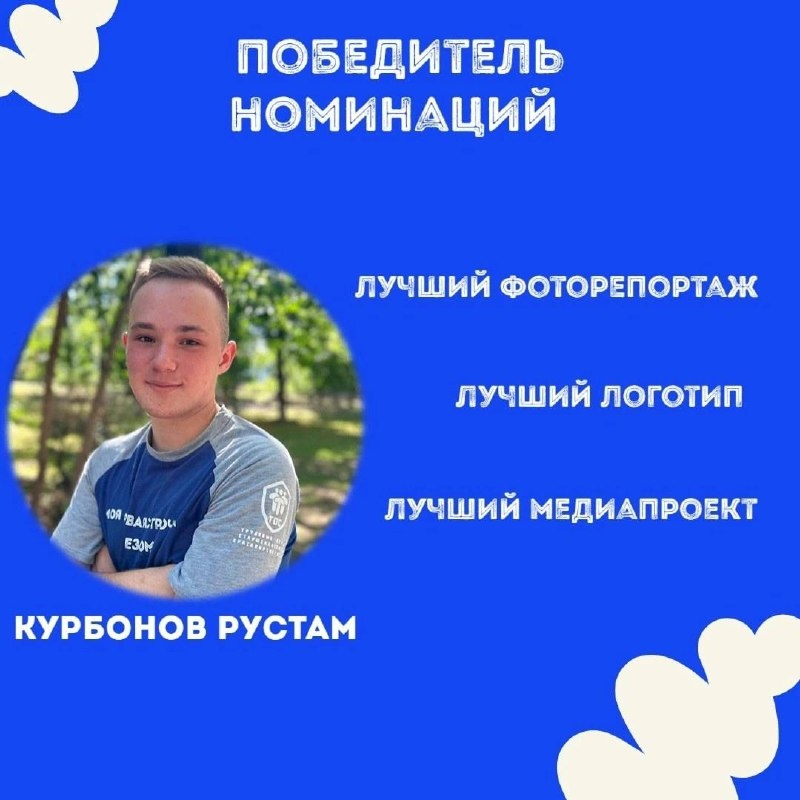 🎉 Объявлены победители краевого конкурса «МедиаТОС»! 🎉 ✨Талантливый активист молодёжного центра «Сибирь» Рустам Курбонов стал победителем в трёх номинациях — «Лучший медиапроект», «Лучший фоторепортаж» и «Лучший логотип»! 😲👏 Этим летом Рустам не только трудился, но и активно участвовал в краевых конкурсах, показывая свои невероятные способности и креативность! Теперь всех победителей конкурса «МедиаТОС» приглашают на Краевой Слёт ТОС! 😉 Это отличная возможность для обмена опытом и вдохновения! Поздравляем Рустама с заслуженной победой и желаем ему дальнейших успехов и незабываемой поездки! 💫👏