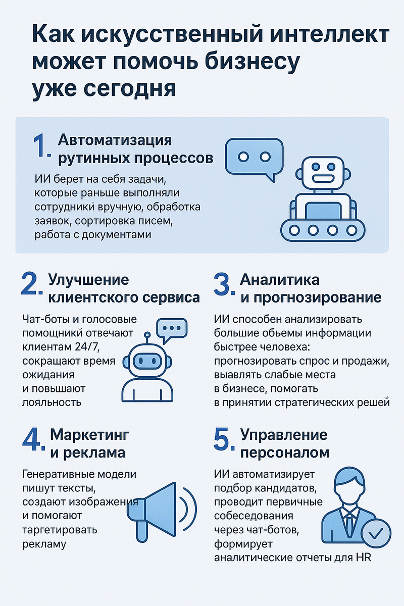 Искусственный интеллект — это не про будущее, а про конкурентное преимущество в настоящем. Многие компании уже используют ИИ, чтобы снизить затраты, ускорить процессы и повысить прибыль. ИИ берет на себя задачи, которые раньше выполняли сотрудники вручную: обработка заявок, сортировка писем, работа с документами. Это экономит время и снижает количество ошибок. Чат-боты и голосовые помощники отвечают клиентам 24/7, сокращают время ожидания и повышают лояльность. А персонализация предложений на основе данных делает продажи более эффективными. ИИ способен анализировать большие объемы информации быстрее человека: Генеративные модели пишут тексты, создают изображения и помогают таргетировать рекламу. Это снижает затраты на креатив и ускоряет запуск кампаний. ИИ автоматизирует подбор кандидатов, проводит первичные собеседования через чат-ботов, формирует аналитические отчёты для HR. 💡 Вывод: