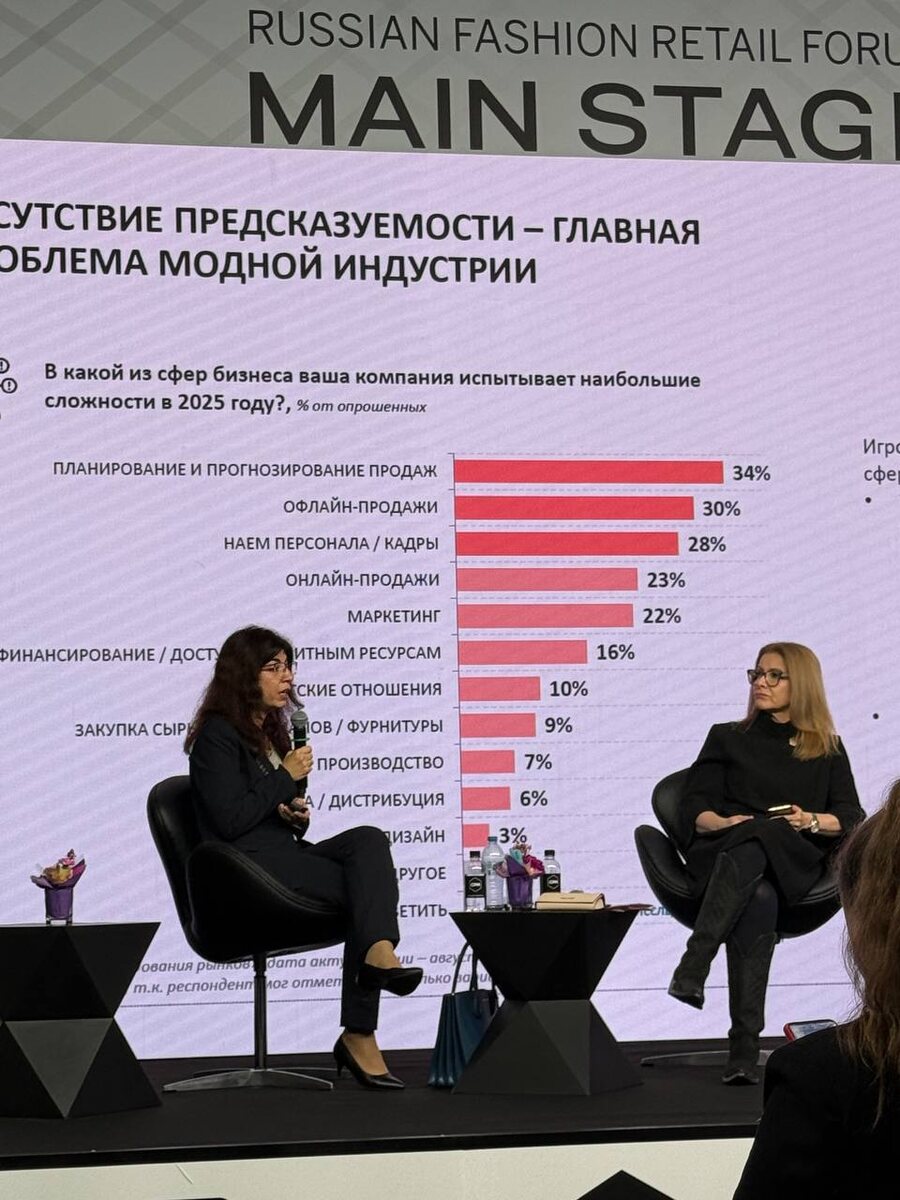Инга Микаелян, «РБК Исследования рынка» 🟤По итогам 2025 года ожидается рост продаж одежды на 9% до 3 306 млрд рублей. 🟤В 2023-24 гг. цены в магазинах выросли на 3,7%, в 2024-25 ожидается рост на 6%. Но на более интересные и востребованные изделия рост выше. Стоимость одной купленной вещи в 2023-24 гг. выросла на 14,2%, по итогам 2025-го ожидается рост на 12%. 🟤Рынок вышел на плато по количеству купленных вещей — показатель не будет расти. 🟤По опросам, потреблять больше мешают цены на одежду, рост обязательных расходов и нежелание «захламляться». 🟤Количество сетевых магазинов падает: февраль 2017 г. — 24408, март 2025 г. — 20999. ➡️70% игроков рынка считают, что рынок моды в кризисе. ➡️50% опрошенных оценивают динамику развития их бизнеса в 2025 году относительно 2024-го носит негативных характер. ➡️63% респондентов оценивают бизнес конкурентов как испытывающий сложности или близкий к закрытию. 🟤Отсутствие предсказуемости — главная проблема модной индустрии. Также в топе