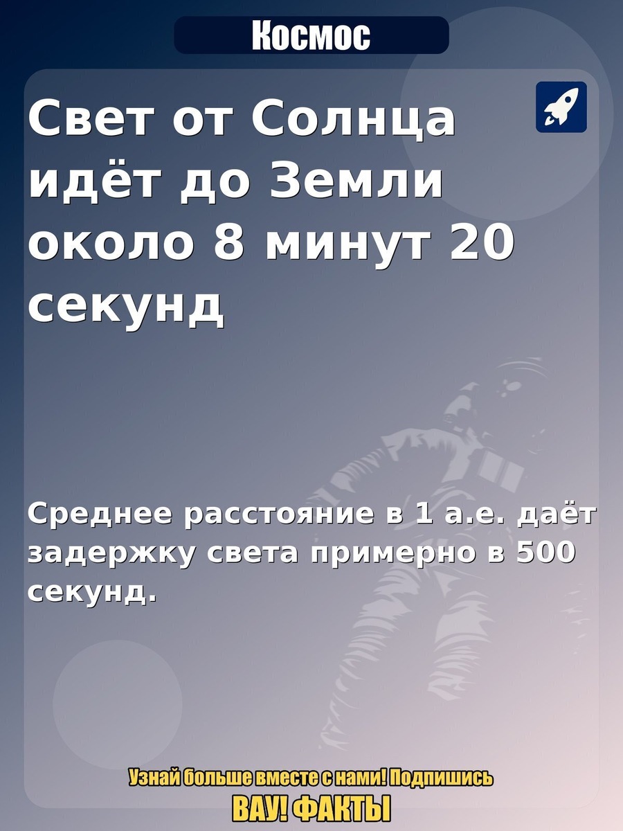 Свет от Солнца идёт до Земли около 8 минут 20 секунд. Среднее расстояние в 1 а.е. даёт задержку света примерно в 500 секунд. Интересный факт по теме «Космос»: Свет от Солнца идёт до Земли около 8 минут 20 секунд. Почему так: Среднее расстояние в 1 а.е. даёт задержку света примерно в 500 секунд.. Поделитесь в комментариях, знали ли вы об этом и стоит ли делать продолжение по теме. #космос #факты #астрономия
