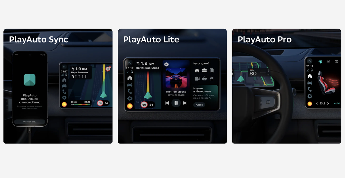 На сервисах Сбера Компания Navio, которая формально не имеет отношения к Сберу, представила собственную платформу для автомобилей Play Auto. Система доступна в трех вариантах Sync, Lite и Pro, которые отличаются степенью интеграции в автомобиль. Sync – полный аналог Android Auto и CarPlay: смартфон подключается к автомобилю и на экране в автомобиле отображаются некоторые приложения, допущенные разработчиками. В случае с Play Auto речь идет о навигации 2ГИС и стриминговом сервисе Звук. Так же доступны голосовой помощник на основе технологий Сбера и возможность оплаты заправки топливом на тех станциях, где доступна такая оплата. Lite – аналог Яндекс.Авто: система предустанавливается в автомобильную систему развлечений и полностью берет ее под свой контроль, включая управления радиоприемником и другими функциями, не связанными с важными узлами автомобиля. Pro – аналог CarPlay Ultra: система контролирует не только развлечения в салоне, но и системы автомобиля, включая управления кондиционе