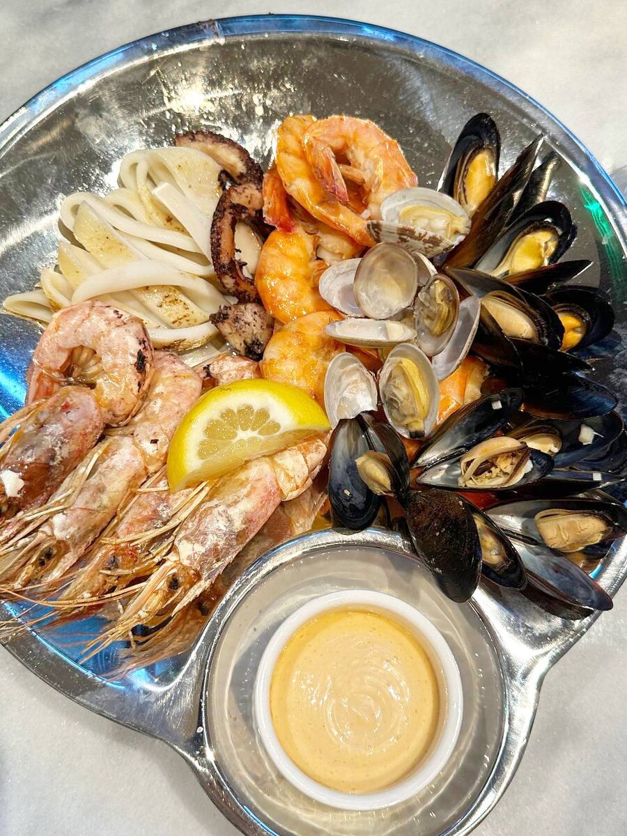 🦐 Качественные морепродукты по доступным ценам На Большой Дмитровке открылось второе Atlantica Bistro, проект Atlantica Group рестораторов Максима и Сергея Дыриных. В бистро на Цветном всегда стоит очередь, поэтому было интересно проверить новую локацию Концепция основана на comfort food из премиальных морепродуктов (22 вида морепродуктов и 11 видов рыбы) при быстрой отдаче (весь заказ нам принесли за 11 минут) В меню огромное разнообразие блюд с отдельным новым разделом, посвященным солнечной Испании, теперь в каждом бистро будет спешл-раздел, посвященный отдельной стране. Цены держат демократичные благодаря прямым поставкам с Дальнего востока и Мурманской области Бистро двухэтажное, красивое, с дорогим интерьером, верандой и открытой кухней Что пробовали: Сначала нас угостили белугой холодного копчения с муссом пармезан и черной икрой, такой комплимент приносят всем гостям до конца августа Продолжили двумя позициями из меню Viva Espana. 🧀 Инжир с муссом из козьего сыра и капе
