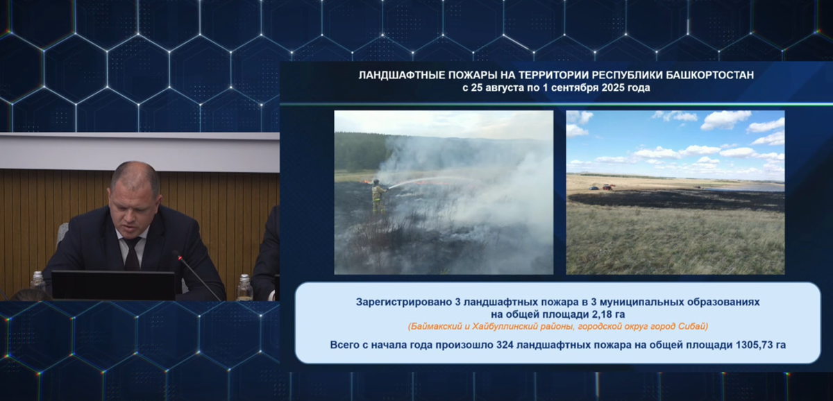 За прошедшую неделю в республике произошло 132 техногенных пожара, в одном из них, который произошел в Уфе, погиб человек, сообщил на оперативном совещании в правительстве председатель Госкомитета РБ по ЧС Кирилл Первов. Благодаря пожарным извещателям в Бураевском районе была спасена женщина с ребенком. Всего с начала года количество пожаров в регионе сократилось на 16 процентов. Количество спасенных увеличилось на 198 человек, однако увеличилось и число погибших – на три человека. «В целях профилактики гибели людей на пожарах за минувшую неделю было проведено 576 профилактических рейдов с охватом более 4,5 тысячи человек», — сообщил спикер. За прошедшую неделю лесных пожаров не произошло. Зафиксировано 3 ландшафтных пожара на общей площади более двух гектаров. Все возгорания были потушены в течение первых суток. Скриншот видеотрансляции оперативного совещания правительства РБ.