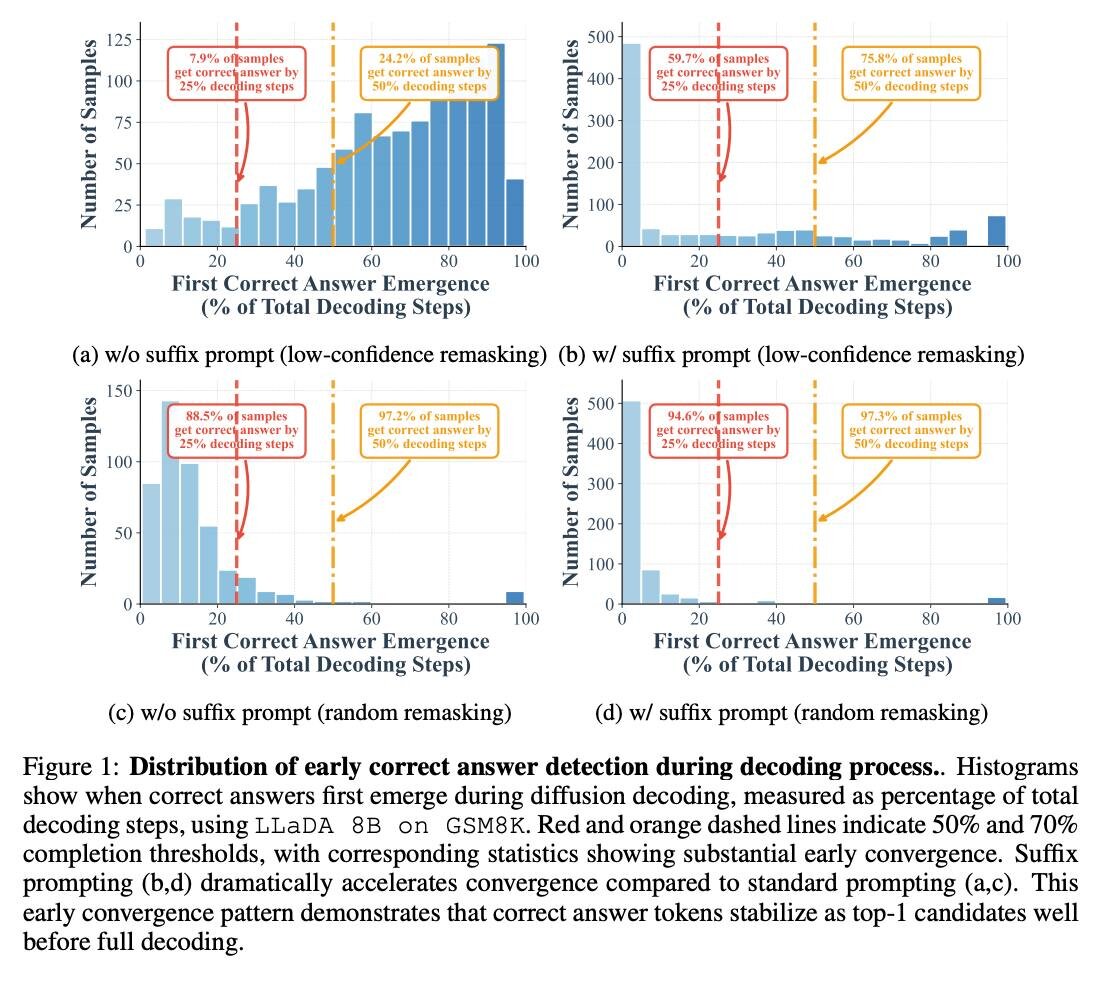 🆕 Исследование: LLM могут находить правильный ответ ещё до конца генерации. На GSM8K — до 97% задач, на MMLU — до 99% ответов верны уже на середине шагов. Метод Prophet позволяет остановить генерацию раньше и ускорить модель в 3.4 раза без потери качества. 💡 Как работает Prophet: 1. На каждом шаге смотрит на разрыв уверенности между топ-1 и топ-2 токенами 2. Если разрыв большой → модель уже «уверена» 3. Декодирование останавливается досрочно, оставшиеся токены фиксируются сразу 🔗 Подробности: arxiv.org/pdf/2508.19982