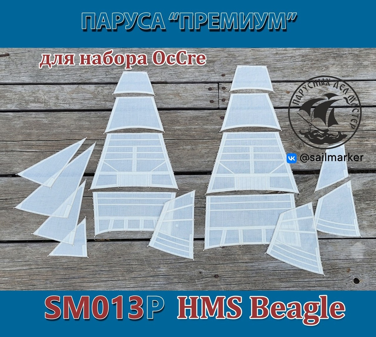 "Парусных дел мастер" из Симферополя выпустила комплект парусов (каталожный номер SM013P) для модели HMS Beagle в масштабе 1/60 от OcCre (Испания, каталожный номер OC12005). "Премиум" комплект из 16 парусов пошит по доработанным лекалам согласно данным известного исследователя флота Карла Марквардта. Паруса подходят под рангоут из набора, имеют все необходимые нашивки с двух сторон по правилам британского флота. Ликтрос ручной свивки.