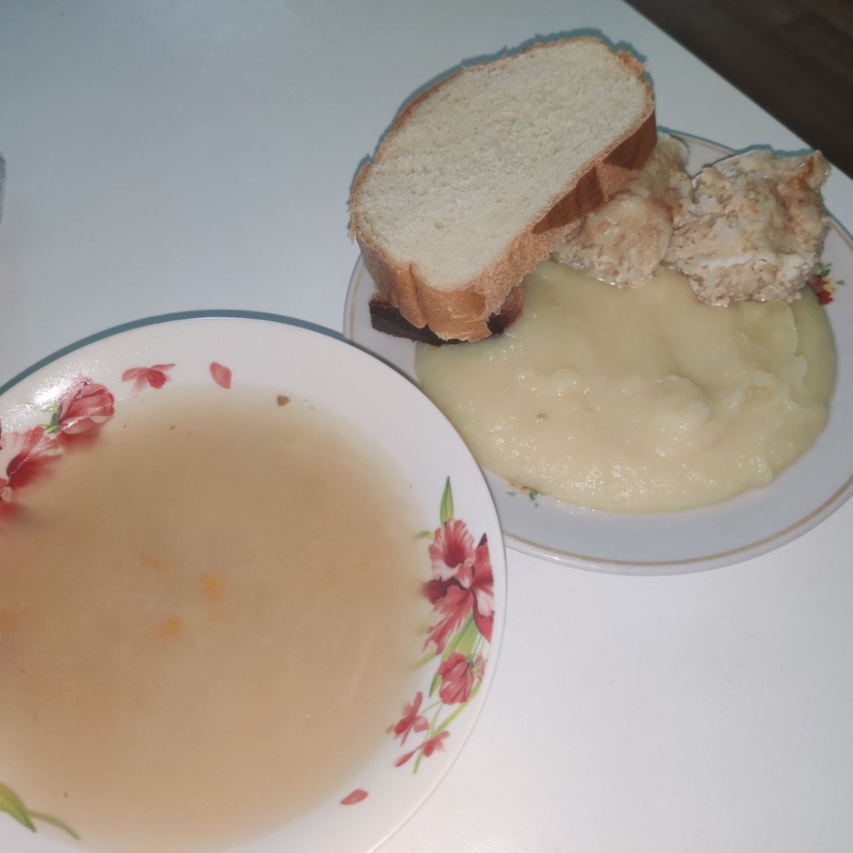 Из всего меню обедов у нас в больнице, это пожалуй самое вкусное. Горячий овощной суп, вермишель, картошка, морковь, лук. На второе картофельное пюре с двумя типа ёжиками из риса и фарша. Ну и мой любимый компот из сухофруктов. Всем привет и приятного аппетита ☕️ Спасибо большое за поддержку ❤️