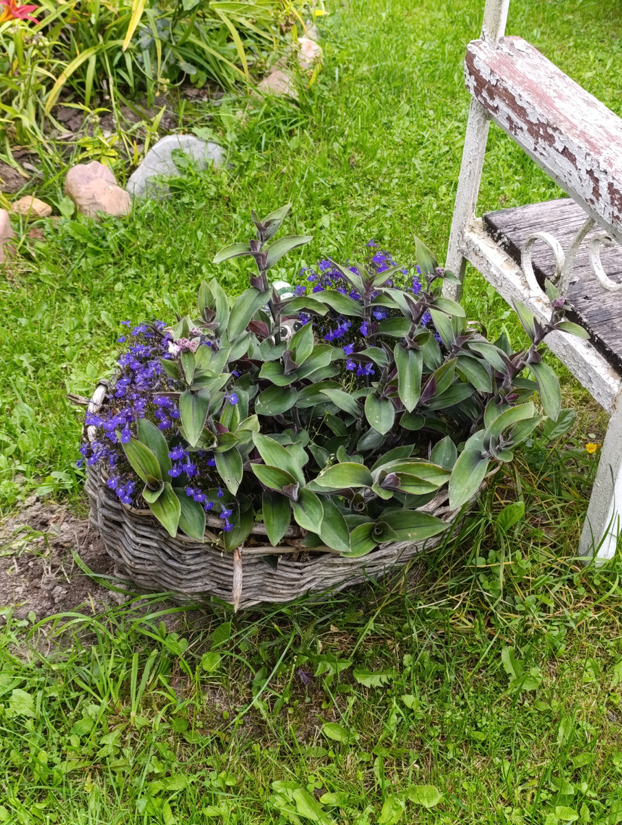 Добрый день всем! На своем участке я предпочитаю натуральный декор- камни, дерево. Всему найду применение. Например, корзина без дна, очень универсальная вещь. Из неё можно соорудить клумбу. Корзинку изнутри обкладываю целлофаном, чтоб не выспался грунт. На дно всякие растительные остатки, сверху перегной. Засыпаю один раз и больше не трогаю и не двигаю. Хватает года на три, пока не развалится, взамен в запасах приготовлена следующая. В этом году посадила лобелию и комнатную традесканцию. Тандем мне понравился. Традесканцию сажала одной веточкой, которая дома всю зиму была ни в живых, ни в мертвых. А сейчас вооон какая! А тут как-то подобрала ещё старушку, не смогла пройти мимо.. Секатором вырезала дно. И одела на куст гортензии. Получилось интересно и тяжёлые ветки больше не лежат на земле. Когда засовывали куст в маленькое отверстие, использовали одну хитрость, чтоб не поломать цветы. Куст туго обернули старым полотенцем, подняв ветки вверх. Корзинка легко опустилась вниз и ничего