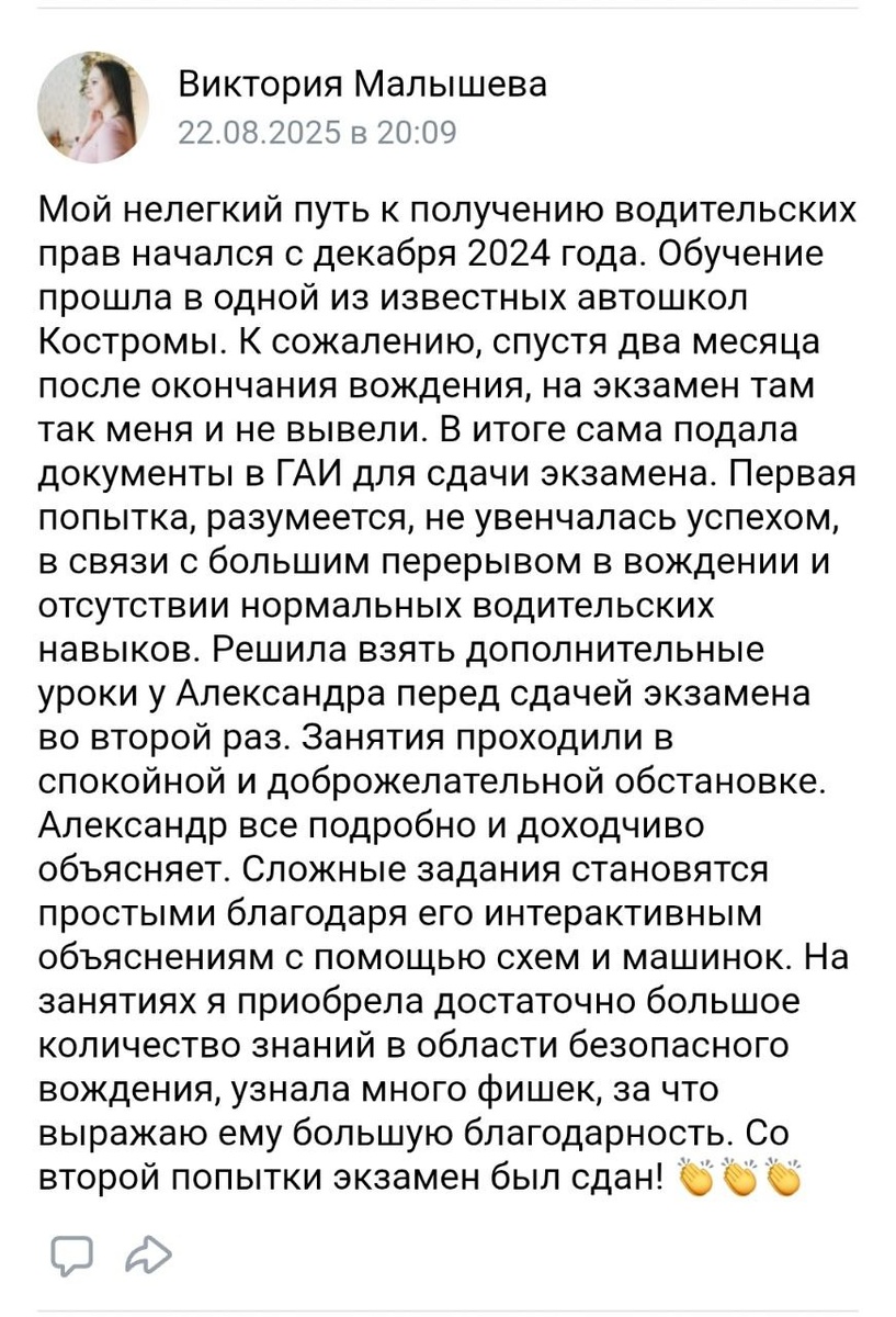 Виктория, благодарю Вас за такой развёрнутый и искренний отзыв! 😊 Вы прошли непростой путь, и Ваш успех — это целиком Ваша заслуга. Я лишь дал Вам нужные инструменты и уверенность. Горжусь Вашим результатом! А теперь — для всех, кто читает этот отзыв и пока ещё сомневается. История Виктории — это готовый рецепт, как сдать экзамен... даже после провала в автошколе. Многие сталкиваются с той же проблемой: отучились, но к экзамену не готовы. Пропадают навыки, нарастает страх. Стандартные автошколы часто не дают главного — понимания дороги, а не просто заученных алгоритмов. Моя методика — это решение для тех, кто хочет не просто «сдать», а научиться водить: 1️⃣. Ликвидирую пробелы. Мы не просто катаемся, а я нахожу и исправляю именно Ваши слабые места. 2️⃣. Объясняю на пальцах. Схемы, машинки — всё, чтобы сложные манёвры стали простыми и логичными. 👍 3️⃣. Снимаю стресс. Спокойная атмосфера — это необходимость для обучения. Без криков и нервов. 4️⃣. Даю «фишки» для экзамена. Те самые