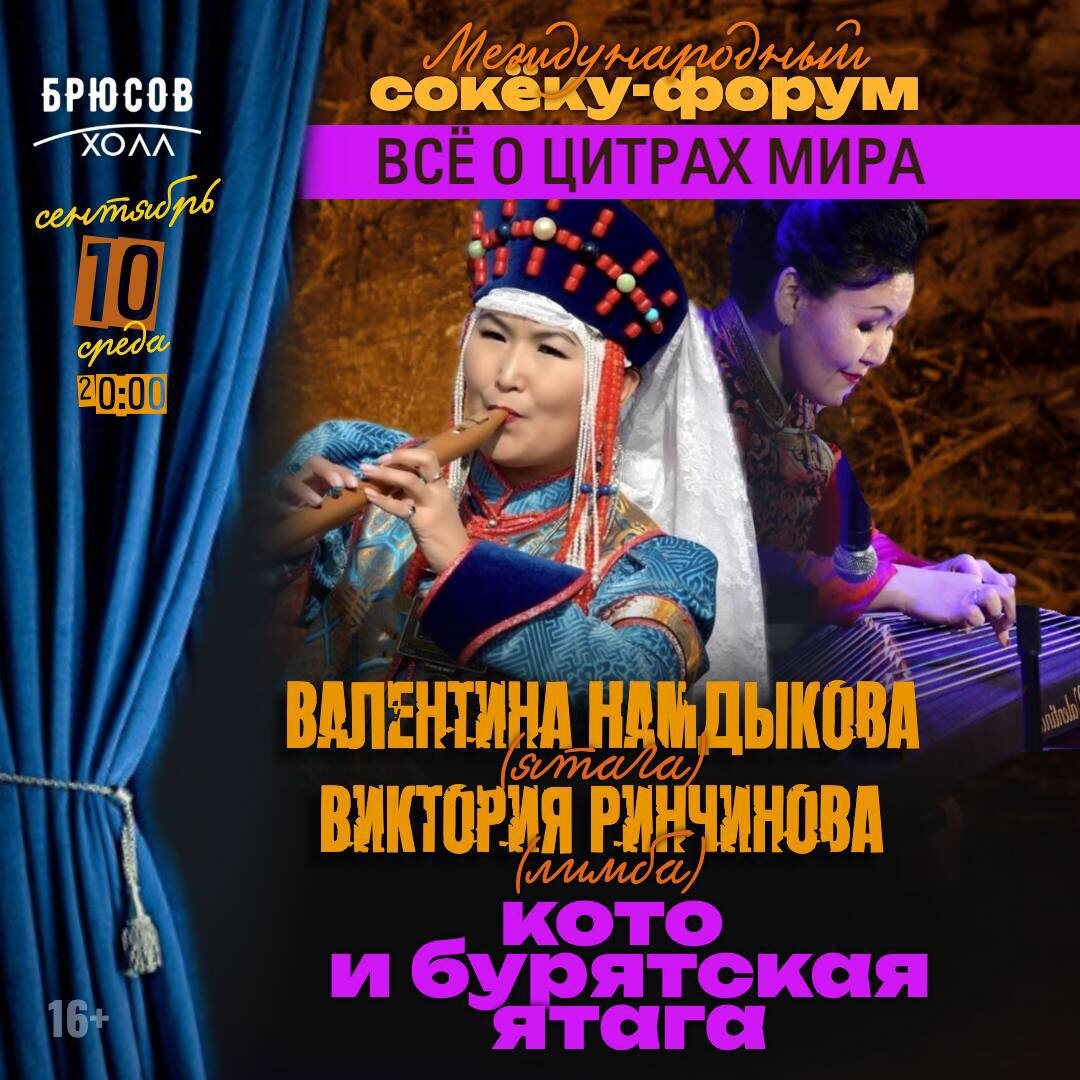 🎶Бурятия на Сокёку-форуме в Москве! Преподаватели Колледжа искусств имени Чайковского выступят на международном Сокёку-форуме в Москве с 7 по 28 сентября. Сокёку в переводе с японского языка значит «музыка для кото» — именно этот инструмент рода цитры является центральным для форума. Кроме него будут также представлены родственные инструменты и традиции разных народов мира. В этом году на форуме прозвучат русские гусли, тувинский чадаган, удмуртский крезь и бурятская ятага. 10 сентября в 20:00 в Брюсов-холле состоится концерт-лекция «Кото и бурятская ятага». Делегацию от Республики Бурятия представят музыканты, преподаватели Колледжа искусств им. П. И. Чайковского Валентина Намдыкова, заслуженный работник культуры РБ Виктория Ринчинова и Майдар Дамбаев. Приглашаем всех ценителей бурятской музыки 10 сентября в 20:00 в Брюсов-холл (г. Москва). Билеты: https://brusov-hall.ru/yataga_1009
