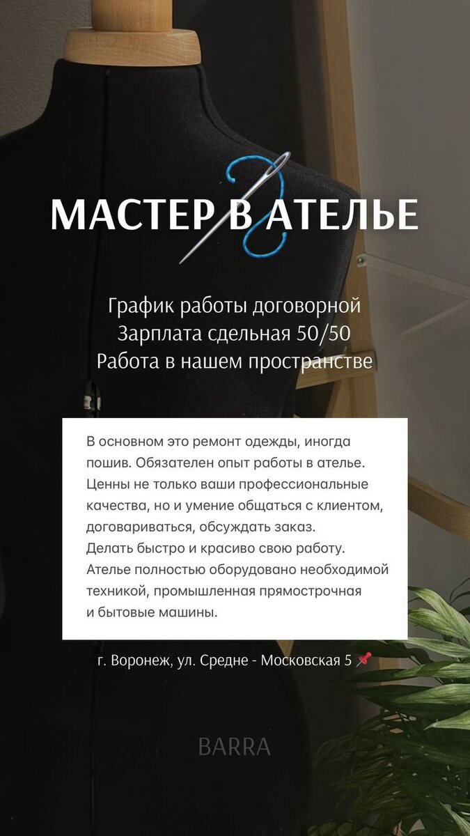‼️ ВАКАНСИИ В BARRA ✅ мастер в ателье; ✅ мастер машинной вышивки. Почему вы захотите у нас работать? Работа в лучшем магазине швейных машин в России, в красивом пространстве в центре города Воронеж. Корпоративный дух, настроение, прекрасное окружение, поддержка в адаптации на новом месте. Отличные скидки на товары, бесплатное обучение на всех наших курсах. Возможность хорошо зарабатывать. Задать вопрос или попасть на первичное собеседование со мной по телефону 89056449780 С уважением, руководитель BARRA, Светлана Шахова. Добро пожаловать в нашу дружную команду! 🤗 г. Воронеж, ул. Средне - Московская 5 📌