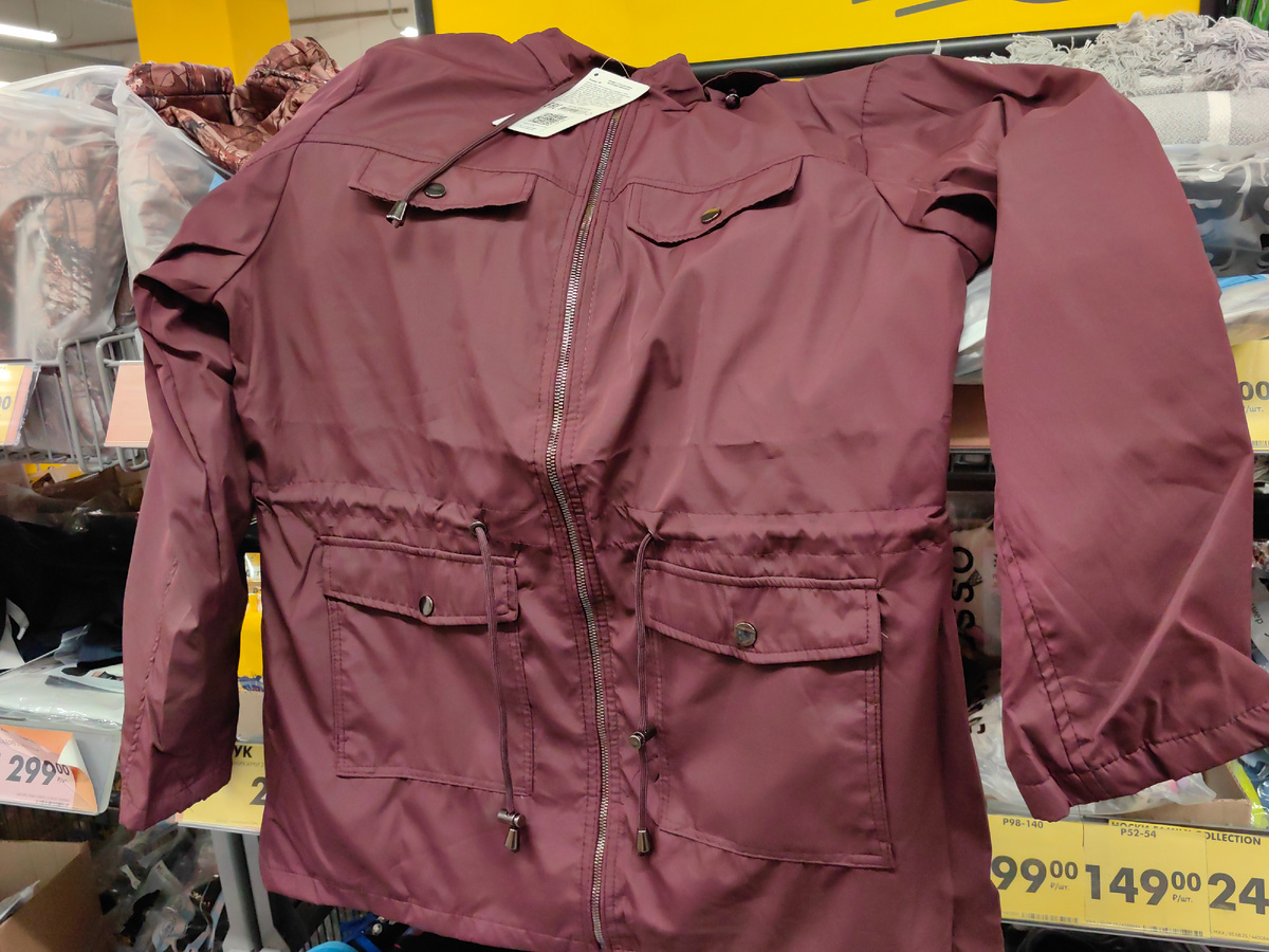 Утепляемся, в магазин Чижик привезли женские и мужские ветровки. И других новинок немало. Женская ветровка одной расцветки, бордовая. Не промокает, отталкивает капли дождя. Удачно, что пояс с утяжкой, можно отрегулировать по фигуре, чтобы не выглядела объемной. На этой фотографии цвет ближе к реальному, ветровка бордовая, не очень яркая, не маркая. Подклад в горошек. Все строчки ровные. Карманы накладные. Застегивается на молнию, такая же, как кнопки, металлическая. Покажу поближе карманы и шнурок на поясе. Верх и подклад из полиэстера. Шея будет прикрыта. Капюшон тоже со шнурком. Не рассмотрела, как крепится край капюшона, по идее, сделан по форме воротника-стойки, вполне возможно, дополнительно закроет шею. Хотя, крутила в руках, не заметила, чтобы была кнопка или липучка. Модель не совсем такая, как на упаковке изображено. Точно нет планки, которая прикроет молнию. Может быть маломеркой, примерьте перед покупкой. Берут такие ветровки, в наличии только две и, судя по количест