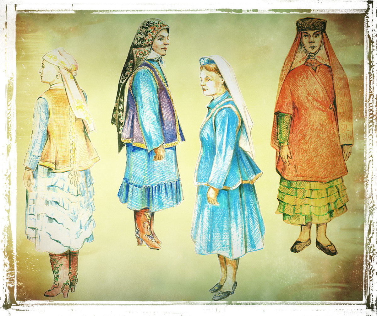 Следуя экспедиционным материалам, на этот раз в фокусе наших интересов окажется небольшая серия зарисовок костюмных комплексов, выполненных в 1972–1974 годах в Пестречинском, Рыбно-Слободском и Зеленодольском районах ТАССР. Данные материалы, хранящиеся в архиве отдела этнологических исследований Института истории им. Ш. Марджани АН РТ, запечатлели не просто элементы одежды, но и способы их ношения, уже ушедшие или уходящие из повседневного обихода к середине XX века. Особый интерес на данных изображениях представляют женские головные уборы и, в частности, сложная система покрывал, которая являлась не только важнейшим компонентом традиционного костюма, но и социально-культурным маркером.