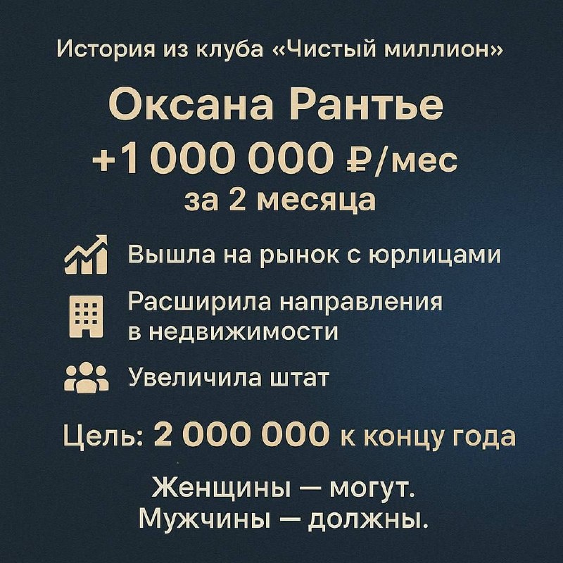«Вышла на рынок с юрлицами, расширила направления в недвижимости, увеличила штат. Доход — почти миллион в месяц. Следующая цель — 2 миллиона к концу года».