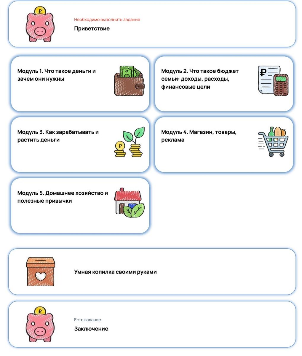 В детском клубе «Дети в деле» появился курс «Приключения копилки». Курс для самостоятельного прохождения детьми вместе с родителями. Если пару раз в неделю будете вместе с ребенком смотреть уроки, а потом обсуждать и выполнять задания - это будет очень полезно для финансового развития! Курс для ребят 6-8 лет (плюс, минус) 4 модуля: 🔶 что такое деньги и зачем они нужны 🔶 что такое бюджет семьи: доходы, расходы, финансовые цели 🔶 как зарабатывать и растить деньги 🔶 домашнее хозяйство и полезные привычки В каждом модуле по 4 урока. В каждом уроке видео и семейные задания. ▫️Пока курс в подписке клуба "Дети в деле". Это выгодно (990 р/мес.).